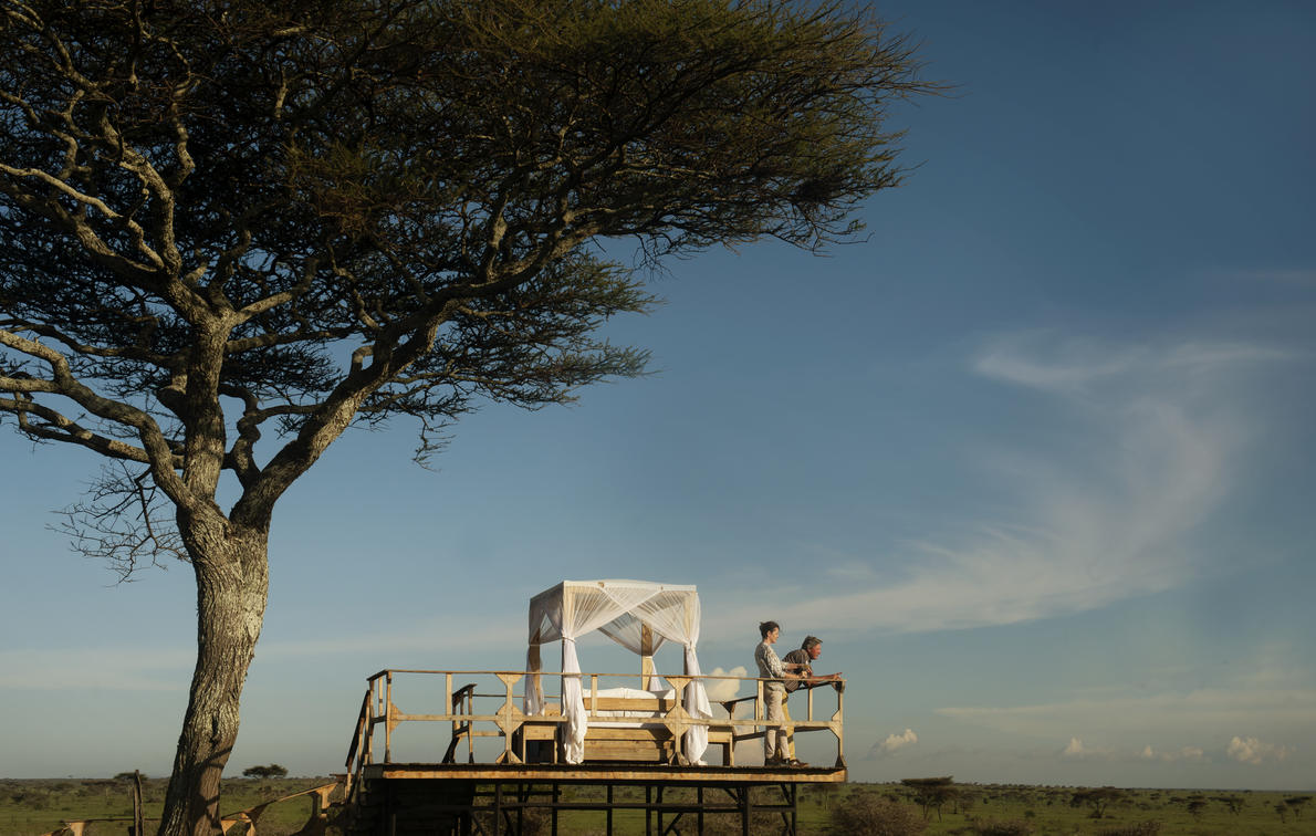 Olmara Camp's three Stargazer mini-suites are designed to merge with the eco-environment, all under canvas, and with expansive views of the wilderness ahead. Each tented mini-suite has a lounge cove with comfortable couches and coffee table, king-size bed with bedside tables and lamps, writing desks, full-length wall mirror, and soft carpets, laid over wooden floors. The suite flows into en suite bathroom with shower, double hand basins, and a flushing toilet. The camp is open, with no borders or rails, the wildlife comes and goes. Stay alert, eyes open; this is the Serengeti.
