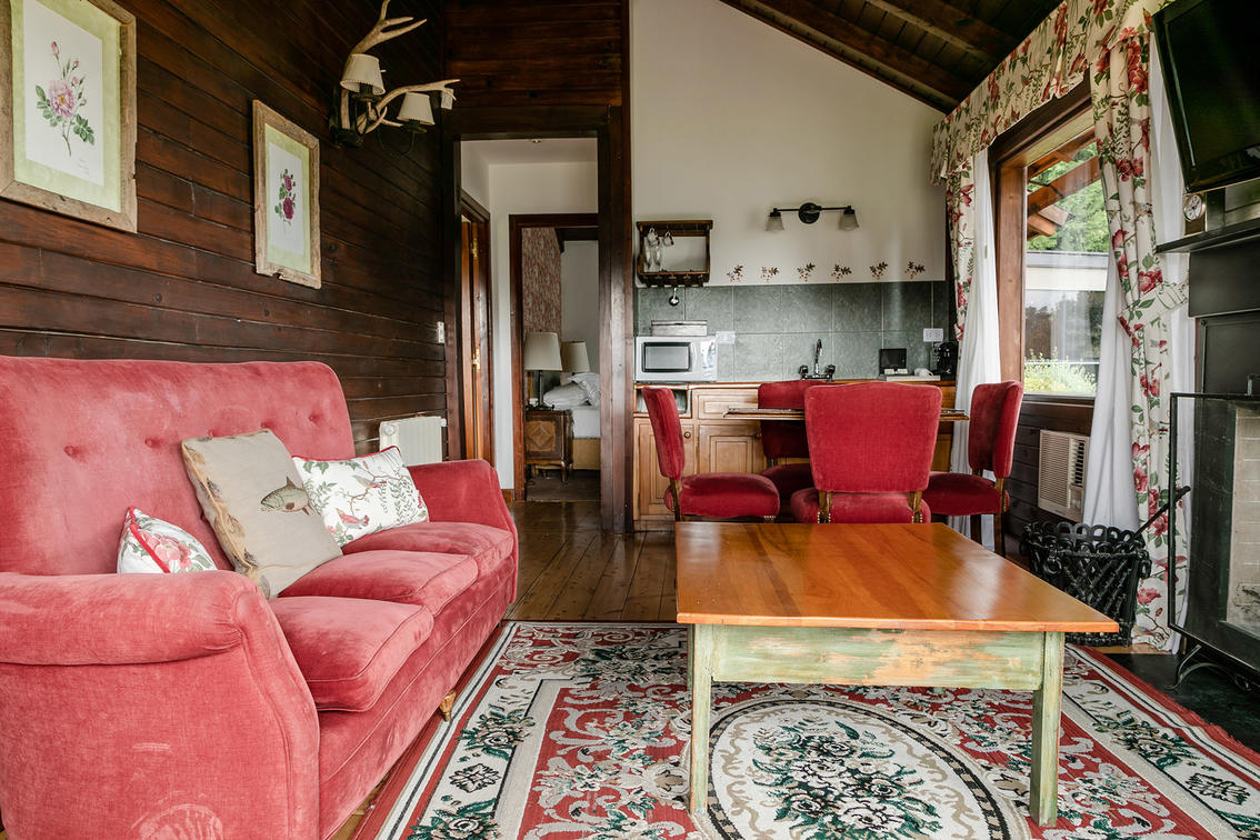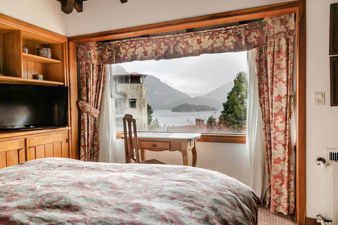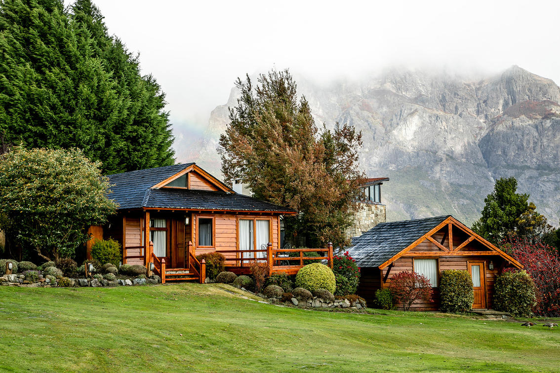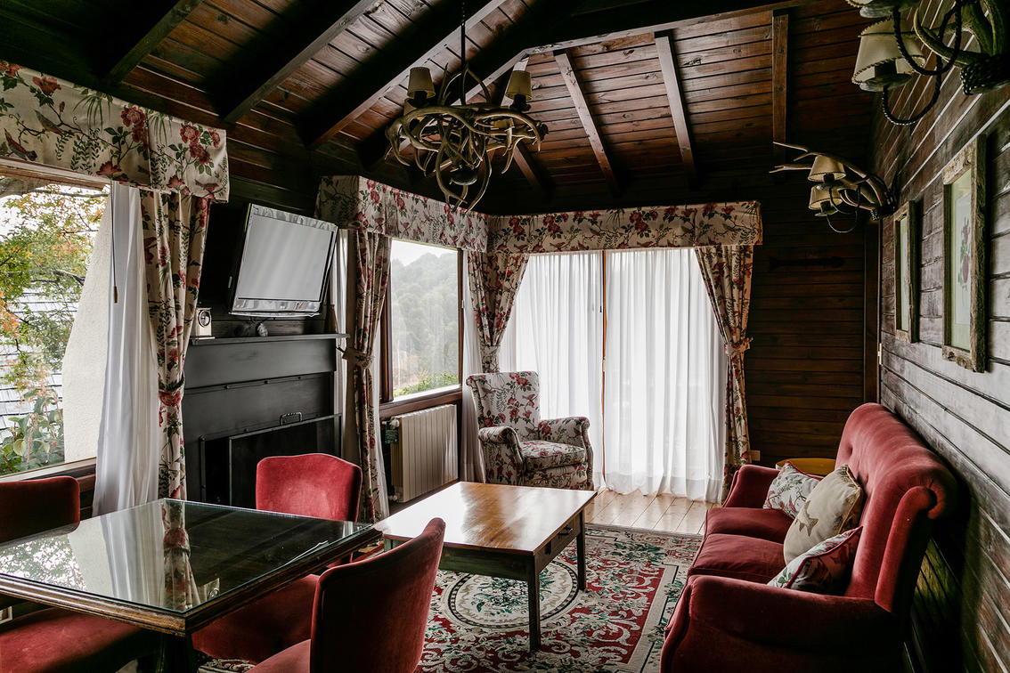 With views of Lake Moreno and Cerro Tronador, it has two bedrooms, two bathrooms, a living room with a fireplace and a deck. It does not have air conditioning (approximately 53 m2).