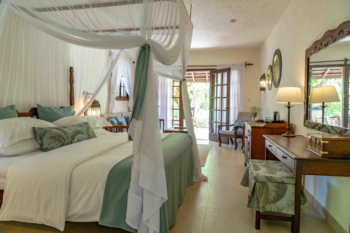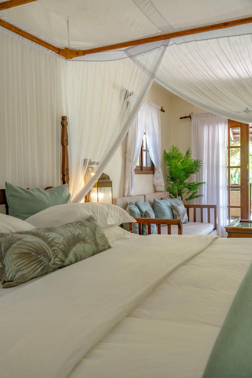 Located on ground floor of our bungalows and with a furnished terrace; Deluxe rooms are tastefully decorated in ivory tones, with cotton throws, teak wood finishes and Zanzibar carvings.