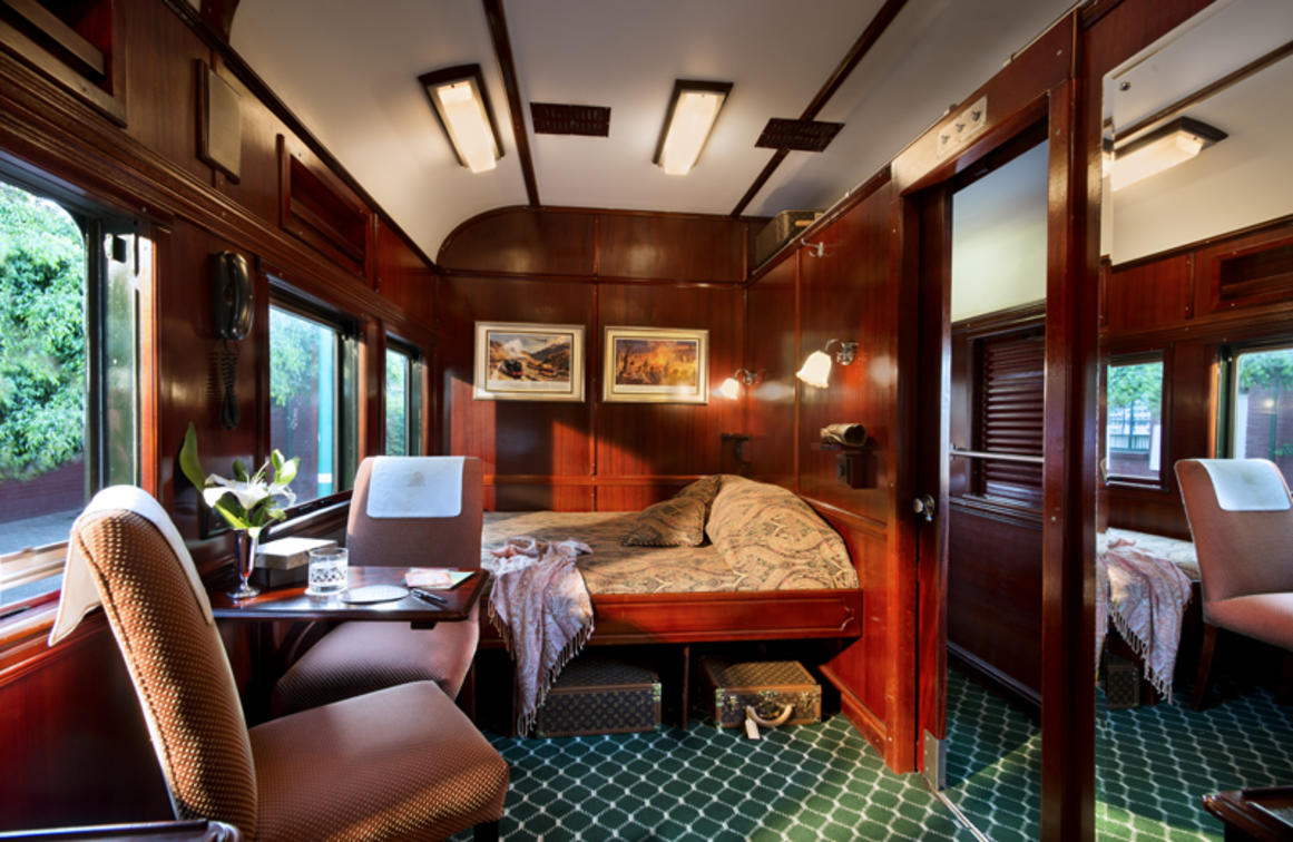 The Royal Suites each take up half a carriage with their own private lounge area and en-suite bathroom with Victorian bath, separate shower, toilet and basin. They accommodate one or two passengers in double or twin beds. A dedicated host/ess is available at all times and services the suites daily. A bar fridge is filled with the on-board beverages of the passengers’ choice.