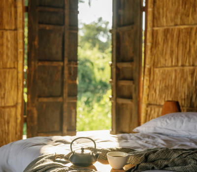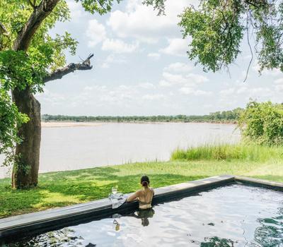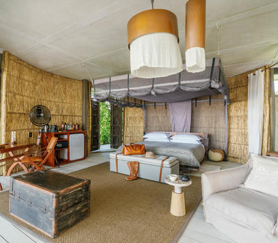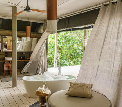 This safari tented room has an expanded design allowing for family use and can sleep up to five guests. Tucked into the tree line overlooking the river and forest beyond, it has been designed with an exquisite eye for detail and flow - the open verandah and outdoor shower blend seamlessly with the interior spaces through a series of generously proportioned windows. Substantial bathrooms boast showers and gorgeous tubs, while the plunge pool on the private deck offers a quiet spot to cool off in the heat of the day.