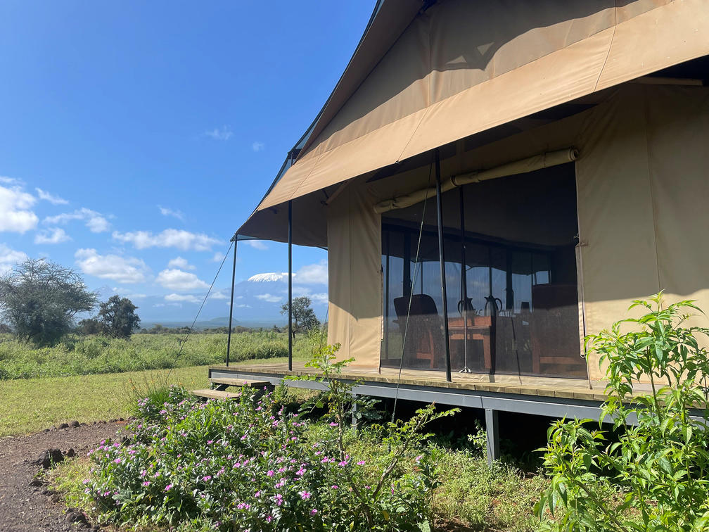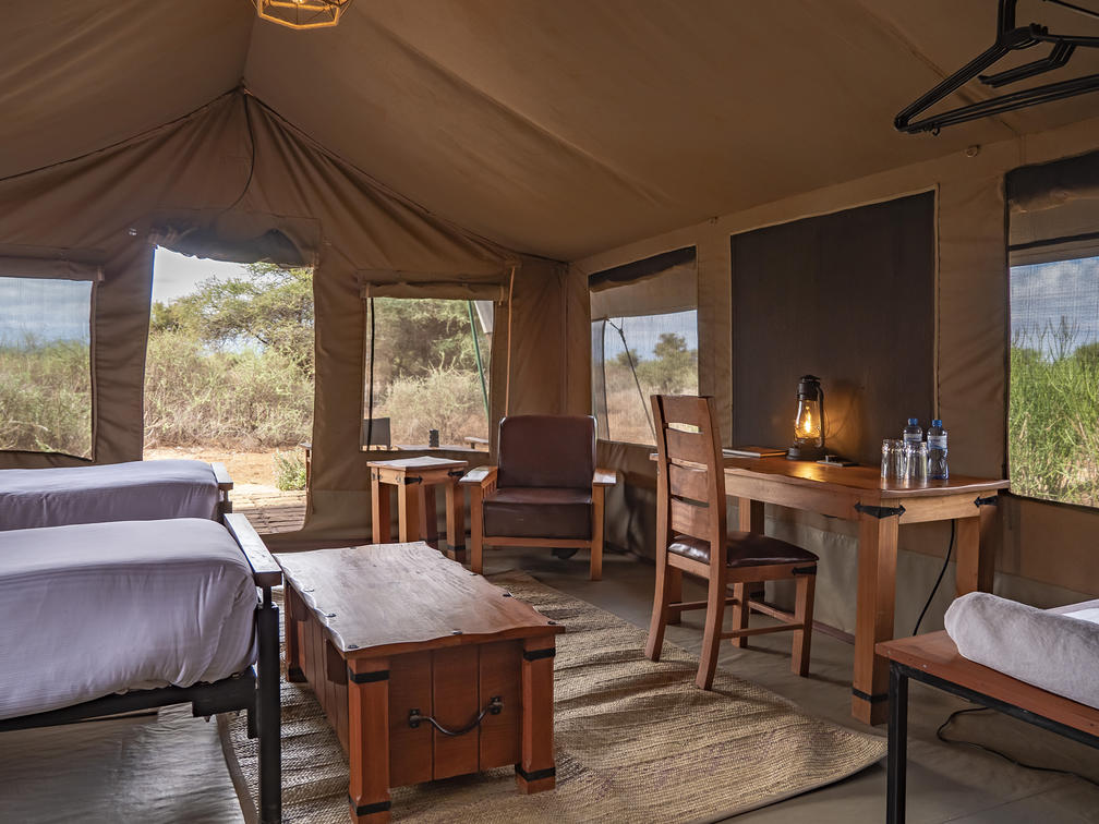 Our Superb tents have covered patios with comfortable safari chairs and incredible views of Mt Kilimanjaro. They are perfect for viewing the game at the waterhole, relaxing, and enjoying the sunset. Enjoy the luxury queen size bed, blanket chest, writing desk and ensuite 3-piece bathroom with 24-hour hot and cold running water. An additional single bed can be added upon request.