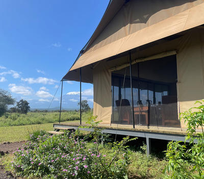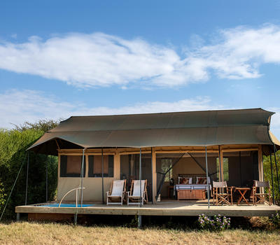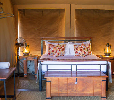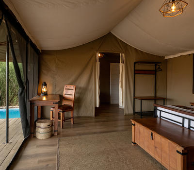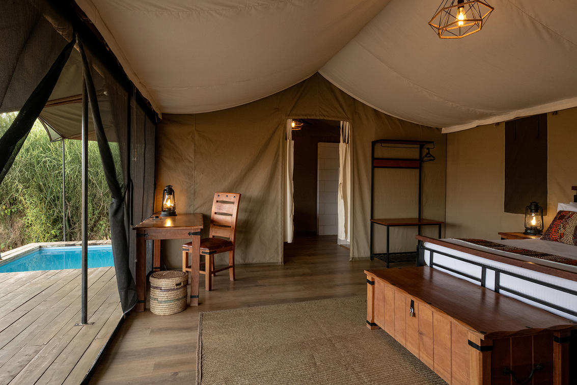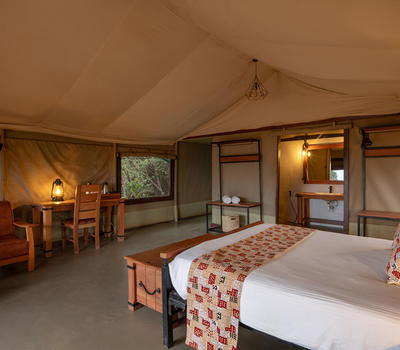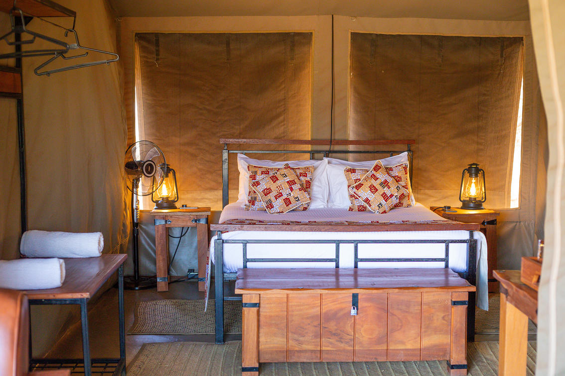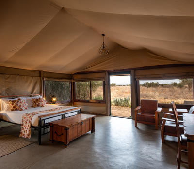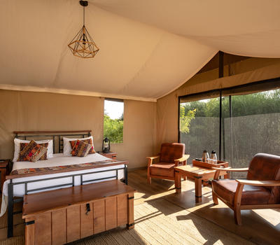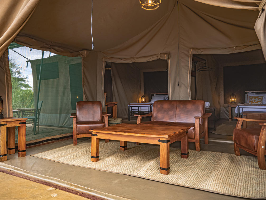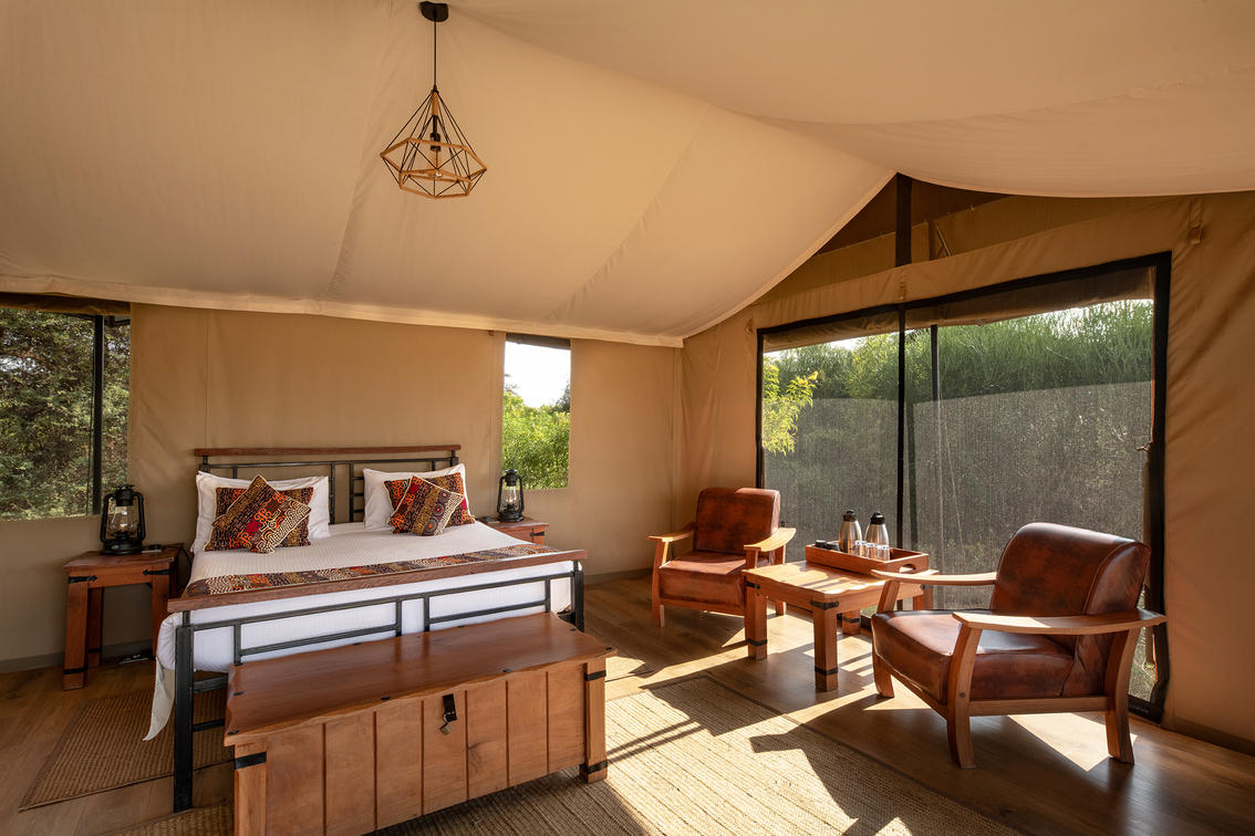 Tulia’s spacious canvas suites offer a calm, grounding retreat with natural textures, soft earth tones, and generous views toward the surrounding plains. Each tent features a comfortable queen or twin configuration, en-suite bathroom with hot shower, and thoughtful touches such as handwoven baskets and locally crafted furnishings.