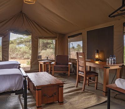 Tulia’s spacious canvas suites offer a calm, grounding retreat with natural textures, soft earth tones, and generous views toward the surrounding plains. Each tent features a comfortable king or twin configuration, en-suite bathroom with hot shower, and thoughtful touches such as handwoven baskets and locally crafted furnishings.