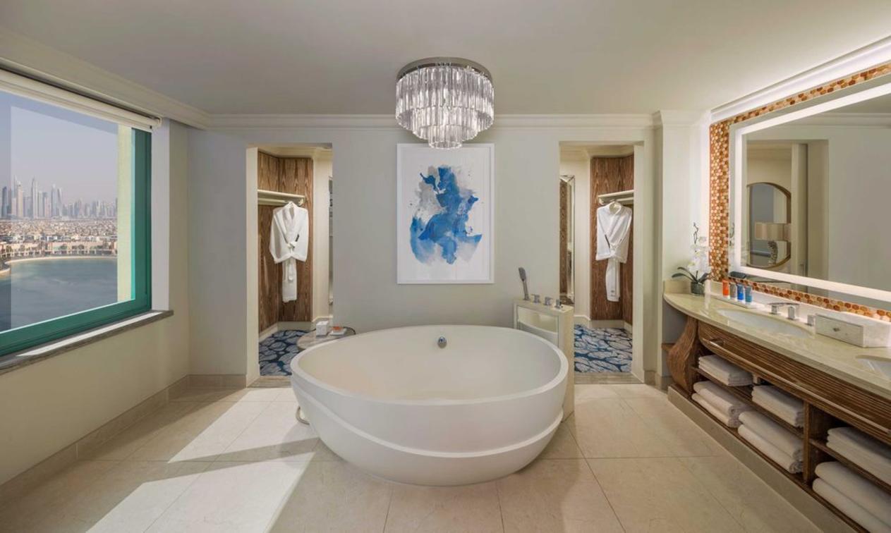 The well-appointed bathroom features a freestanding oval soaking tub, separate walk-in shower and his and hers vanity sinks. Experience breathtaking views of the Arabian Sea or glittering Dubai skyline from the Executive Suite’s terrace.