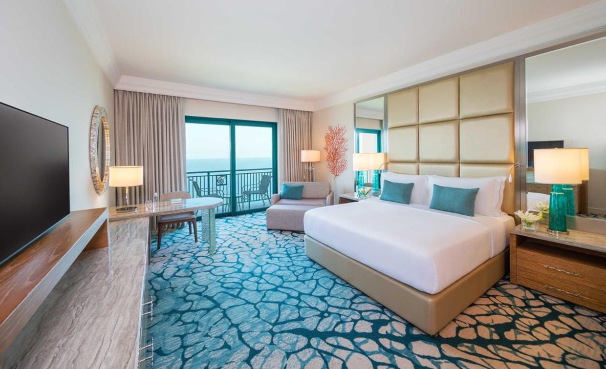 Experience views of Dubai’s Palm island and fall asleep overlooking the glittering Dubai skyline. With contemporary and sleek designs inspired by the ocean, the Palm Room offers spacious comfort at 45-47sqm, including a large bathroom with a separate bath. This room includes tea and coffee facilities, a minibar, a TV, a balcony, and 24-hour room service.