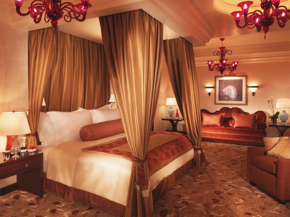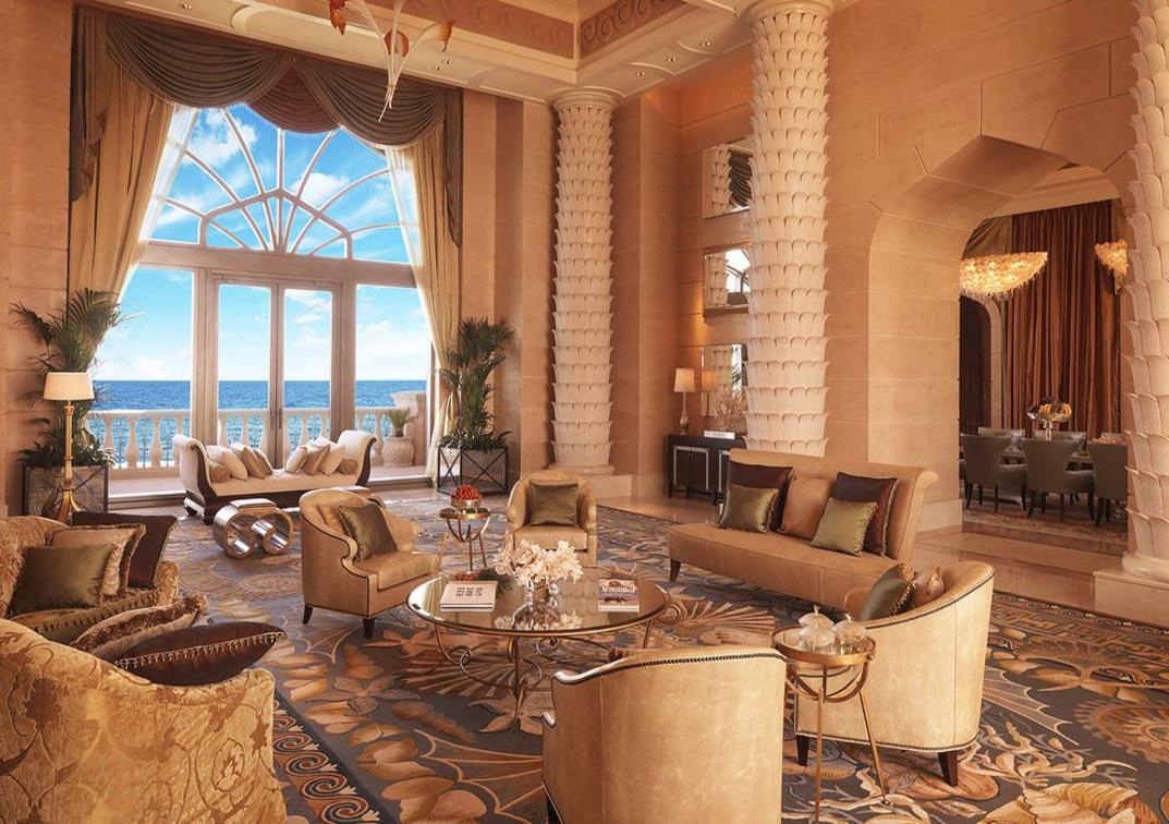 Magnificent marine-themed fountains welcome guests to the Grand Atlantis Suite. A palatial living area boasts kingly gold undertones and regal furnishings.