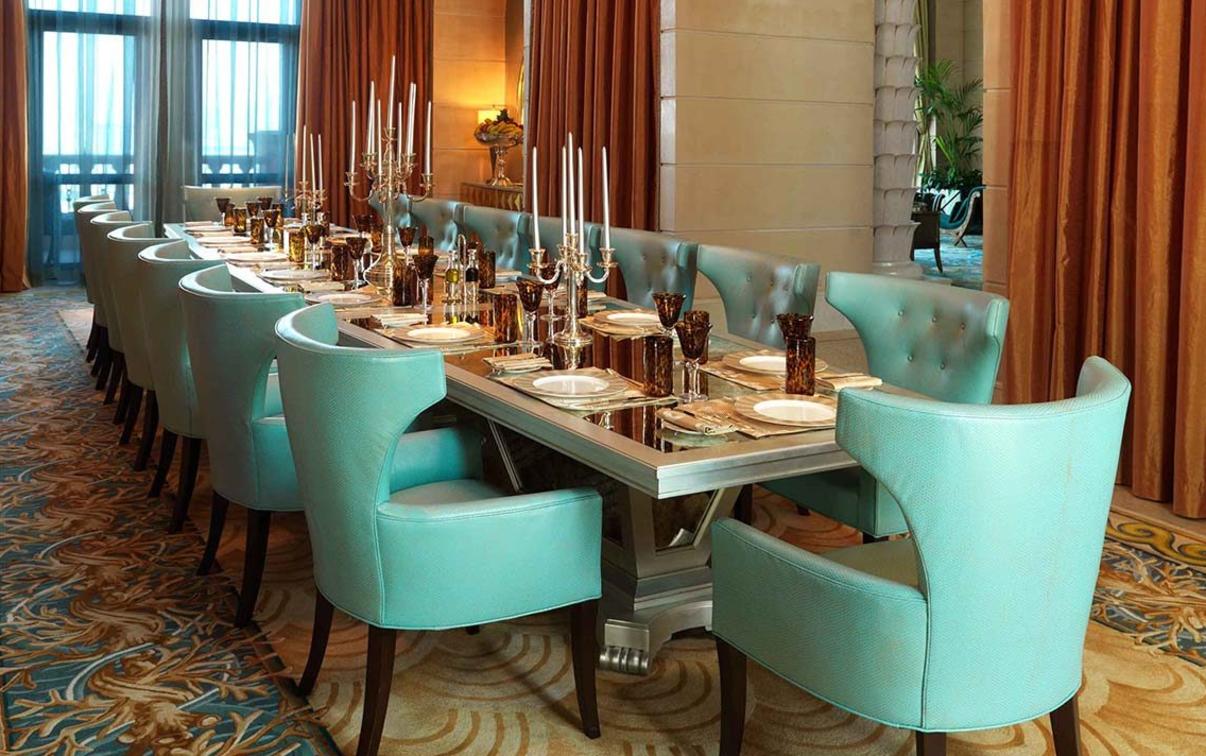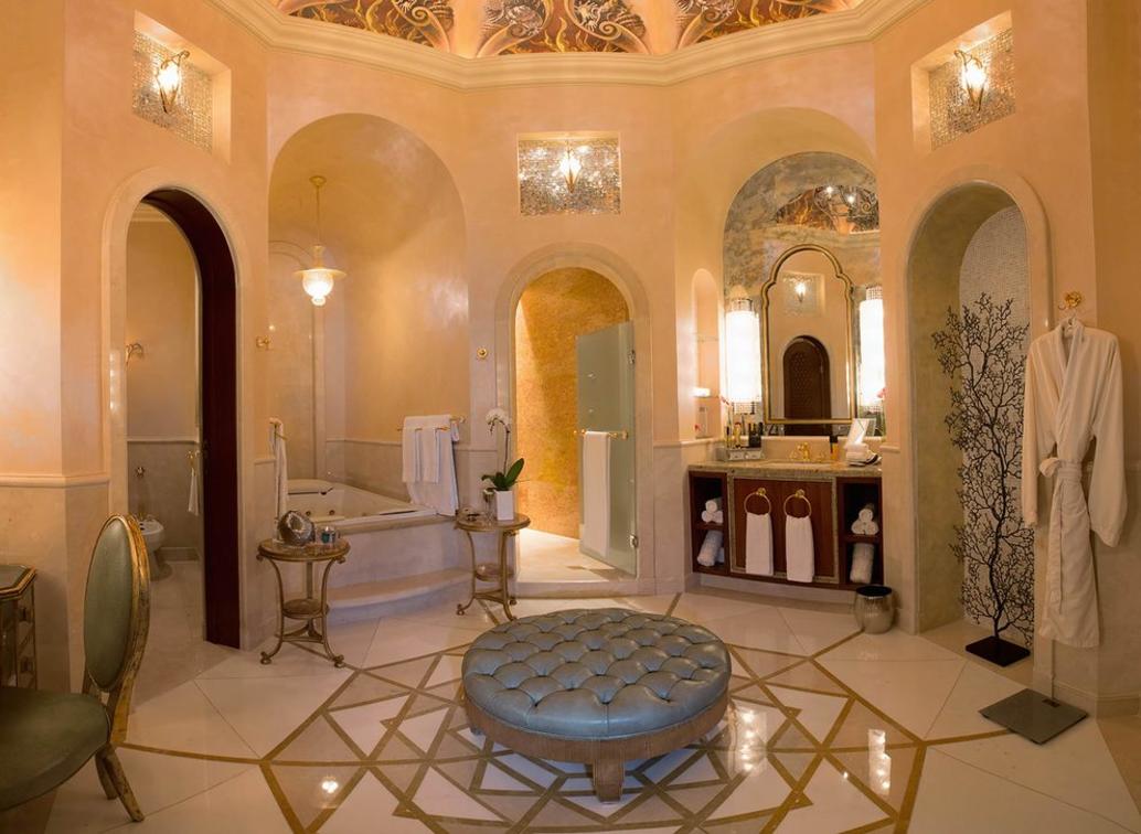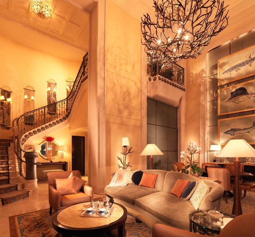 With a palatial lounge, three opulent bedrooms, soaring ceilings, a private library, a media and games room and a 16-person dining room, the Royal Bridge Suite sets a new standard for luxury. Mixing intricate Arabic design with plush contemporary style in brilliant golds and elegant marble, the beauty of the Royal Bridge Suite easily takes guests' breath away. The suite's sweeping, panoramic views across the mighty Palm island, sparkling Arabian Sea and magnificent Dubai skyline allows for one of the most exquisite views in the city. Fine details are taken care of for guests in this suite, from a guarded entrance and private elevator to a dedicated, 24-hour team of butlers and chefs.