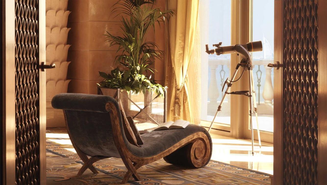 Guests can soak up the sun in one of the suite’s five balconies spanning three sides of the suite, with near panoramic views of the gleaming Arabian Sea, iconic Palm island and shimmering Dubai skyline.