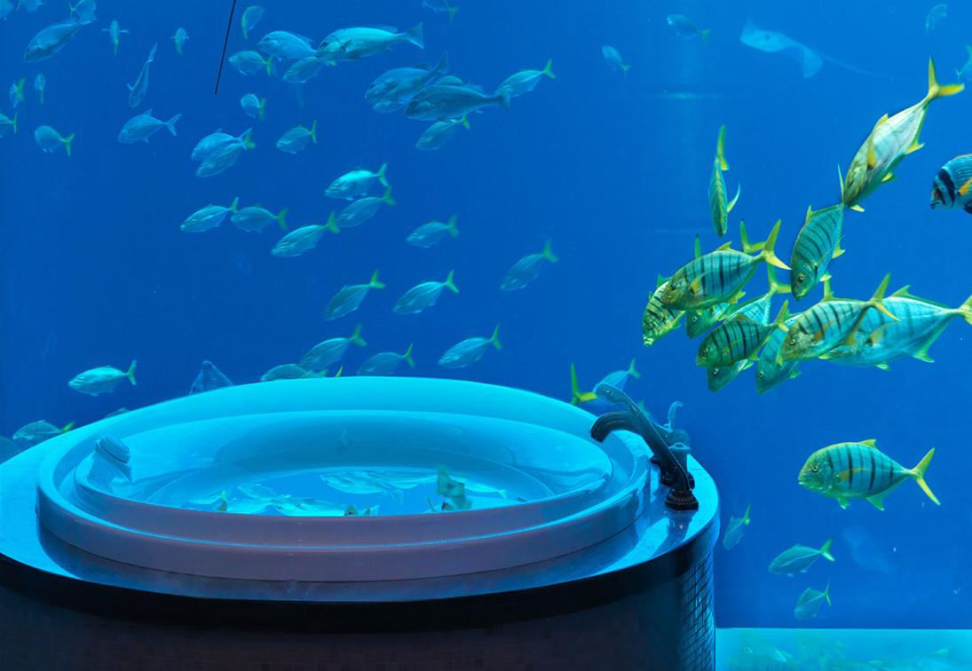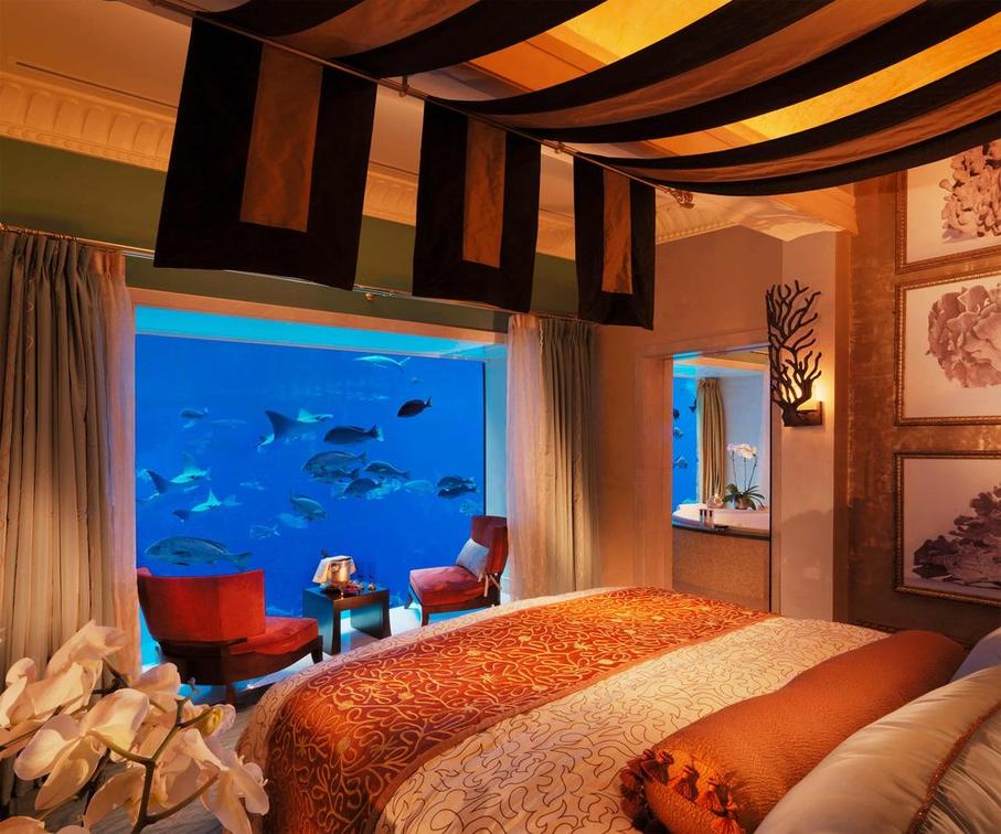 In perfect harmony with its surroundings, the Underwater Suite is a haven for peace and tranquility. Dreams come true in the Underwater Suite, which features immense floor-to-ceiling windows into the hotel's 65,000 marine animal aquarium. In this suite, guests can float the evening away in the marble jacuzzi with private views of the Ambassador Lagoon, and be mesmerized as sharks, rays and fish glide right past the bed.