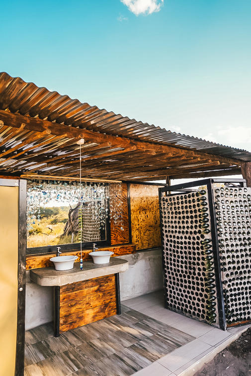 Bathroom with double basin, vanity, shower, toilet, hot water fueled through a donkey boiler using 70% recycled carton fire bricks made at The Sijwa Project;