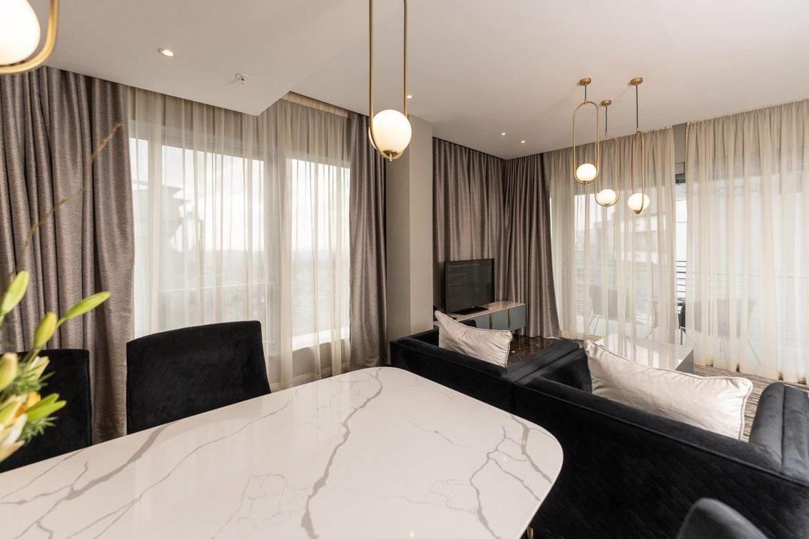 The West Penthouse boasts a fully equipped kitchen outfitted with premium Smeg appliances, a Miele gas stove, a separate scullery area, a wine cooler, and a full-length fridge with a built-in coffee machine. The sophisticated dining and lounge area, perfect for hosting up to eight guests, sets the stage for memorable gatherings.