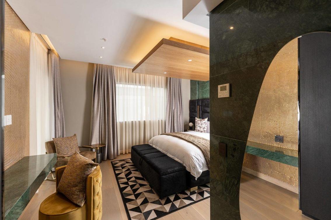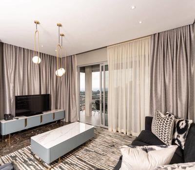 Spacious and luxurious, our Junior Suite boasts abundant living space and panoramic views over Sandton and the North of Johannesburg. . The kitchen is fully equipped and offers a 2-plate induction cooker with extraction hood, An undercounter oven and Microwave. A mini-Bar fridge is standard in all rooms and can be stocked upon request. Each room is equipped with an iron and board for convenience. A separate King Size Bedroom offers the privacy separate from the living area and the bathroom has a separate shower and bath. Luxurious Charlotte Rhys guest amenities complete our unique offering.