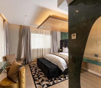 The master bedroom is a haven of elegance, featuring a full rain shower and a vintage-inspired oval bathtub. Luxurious touches like a Dyson hair dryer, and heated marble and wooden flooring enhance the comfort throughout the apartment.