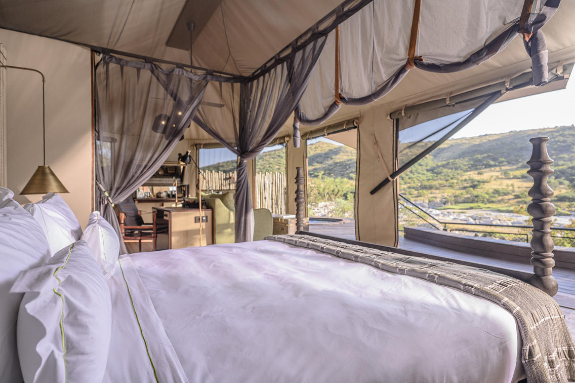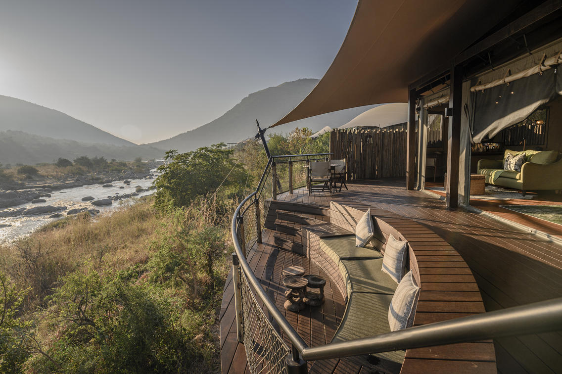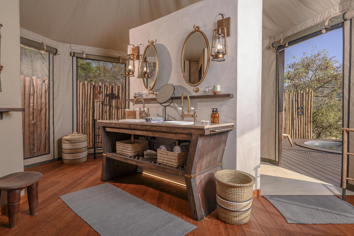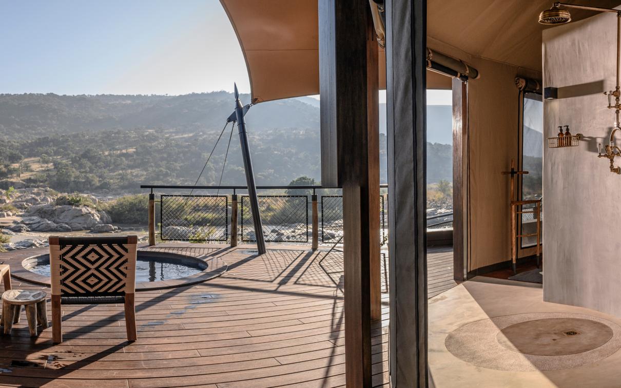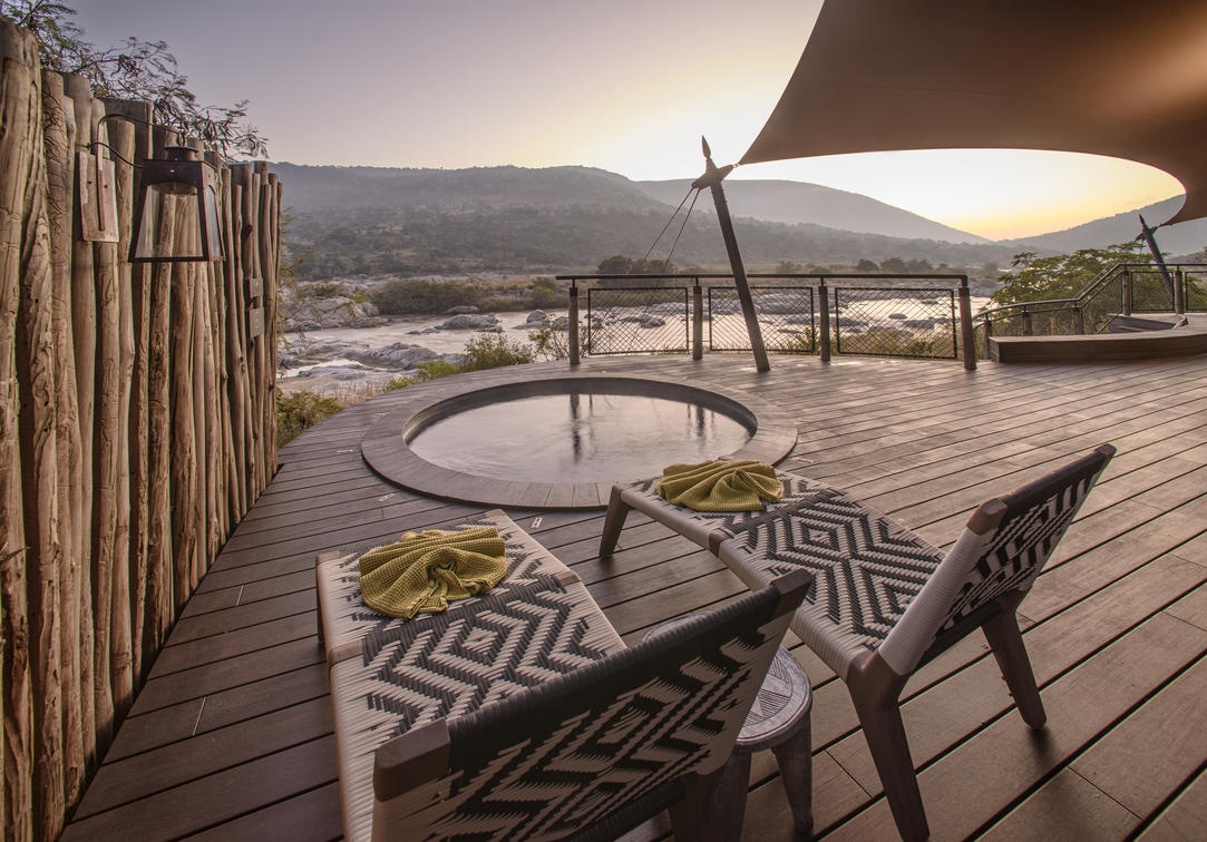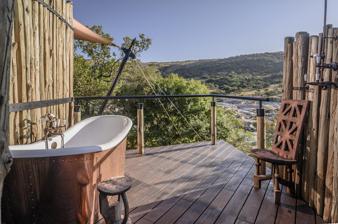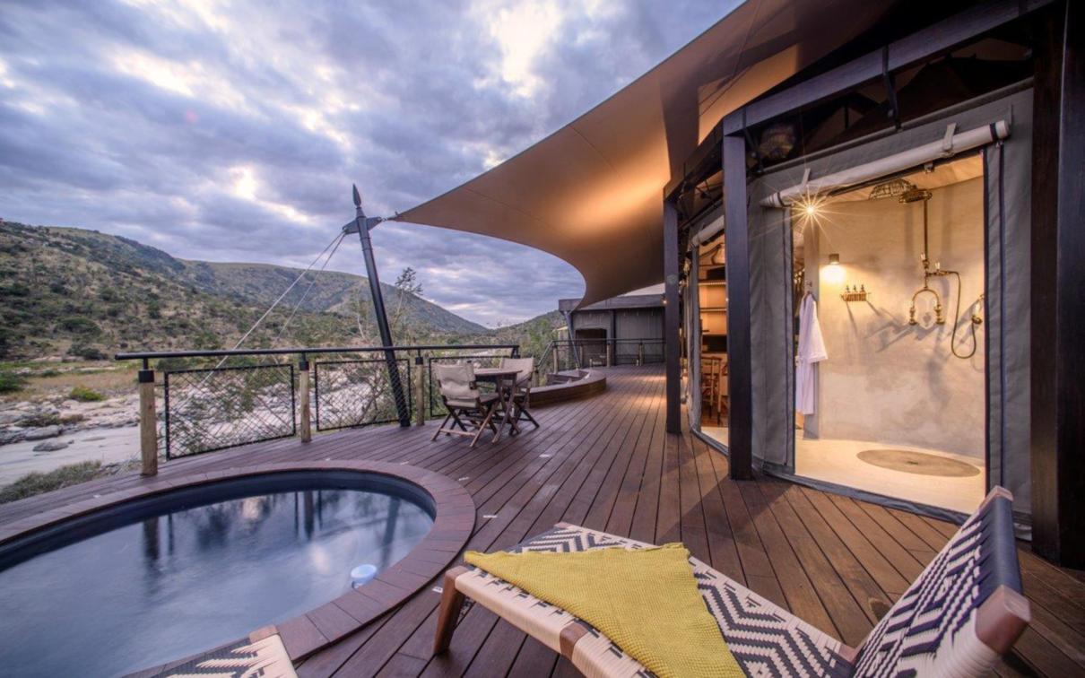 Indulge in ultimate luxury in one of the seven exquisite tents at Madwaleni River Lodge. Each tent features a private heated plunge pool, indoor and outdoor lounges with breathtaking wilderness views, and sophisticated copper bathroom fixtures. Air-conditioned rooms come equipped with iPads for seamless food and beverage orders, ensuring a comfortable stay.