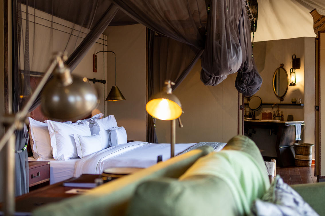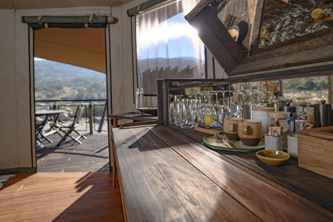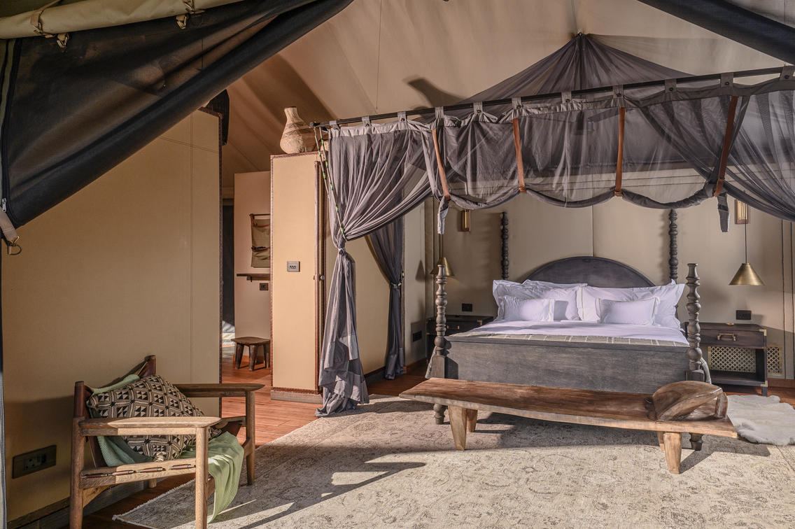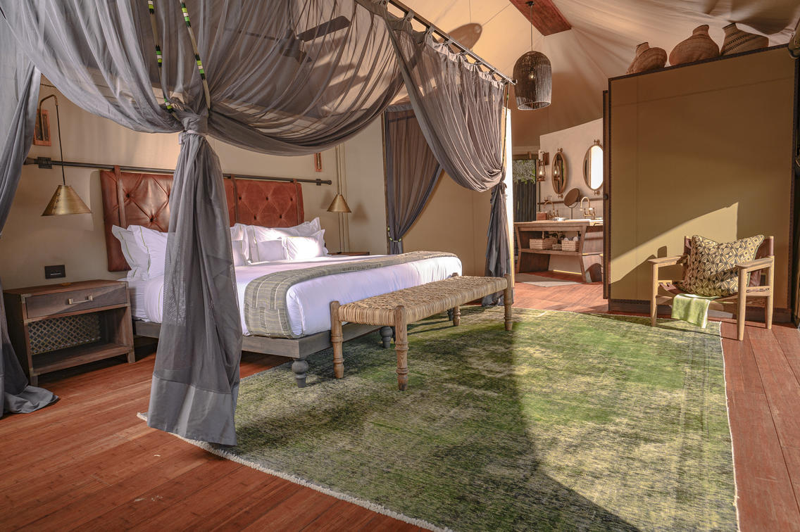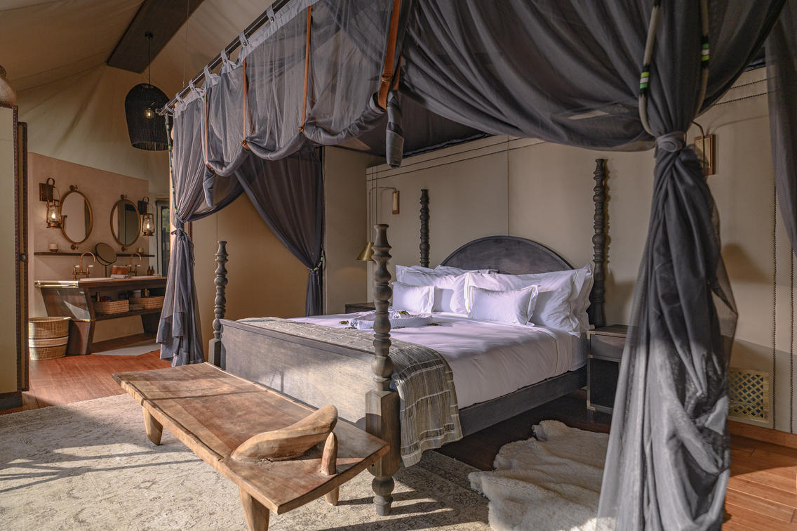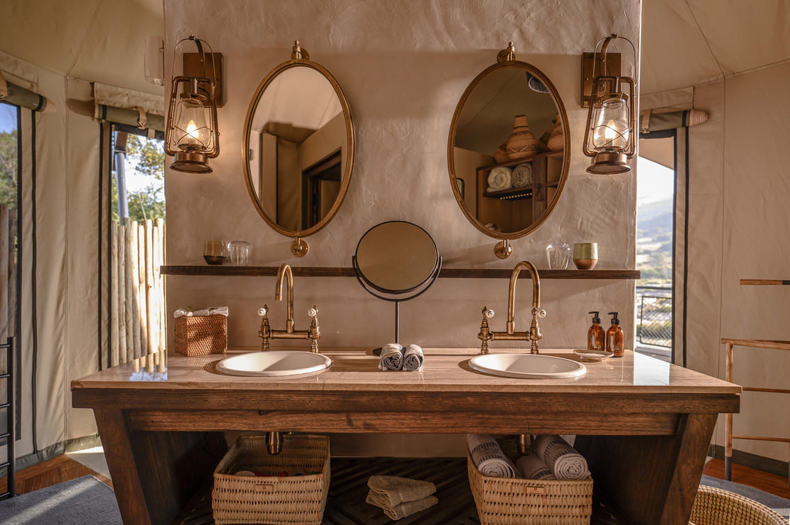 For a romantic escape, a secluded Romance Tent awaits with an outdoor shower and bath. Guests can revel in privacy while enjoying luxurious amenities.