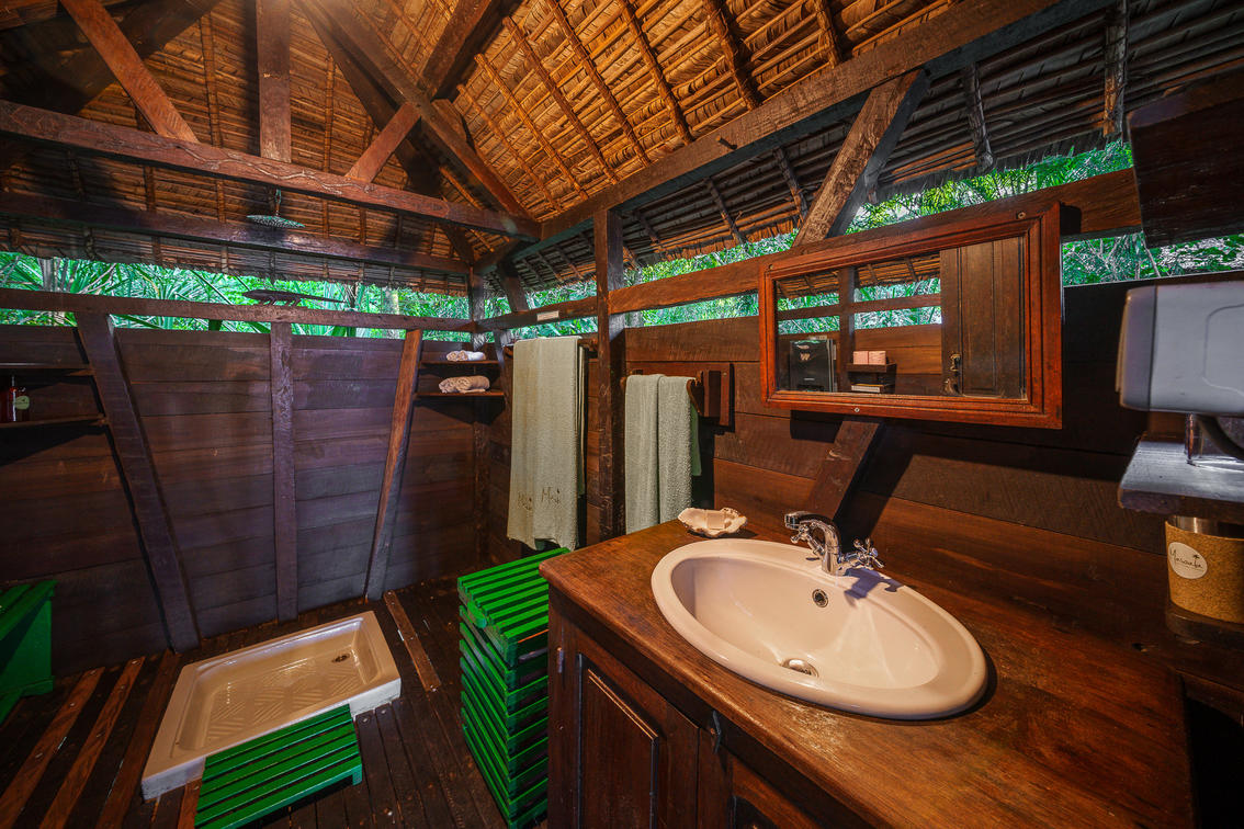 Our seven rooms are traditional African safari tents, but in our case raised on stilted decks within the forest canopy and overlooking the beach. The cool breeze off the ocean or through the rainforest acts as natural air conditioning with the tents and their gauze windows oriented for maximum through drafts. Lying in bed and listening to the gentle wash of the ocean on the golden beach below, or the rustling of rainforest leaves cannot help but let you leave the frenetic energy of the city behind.