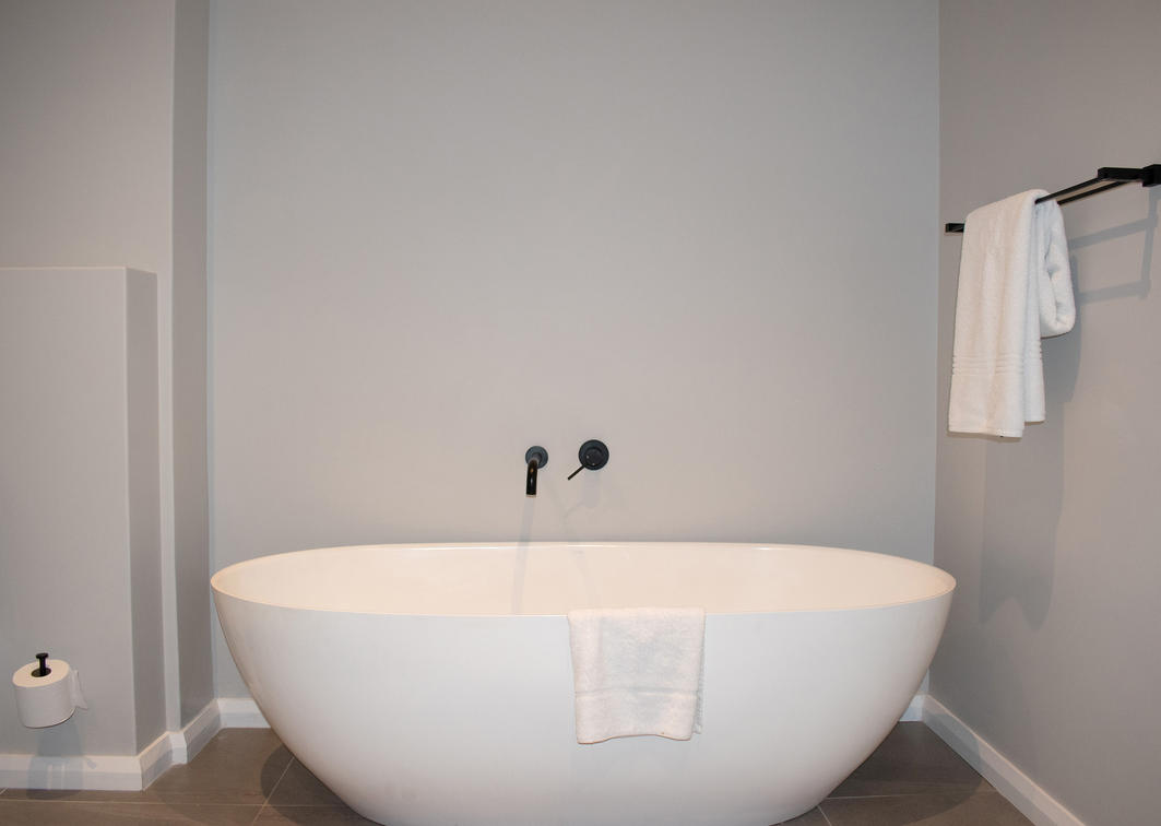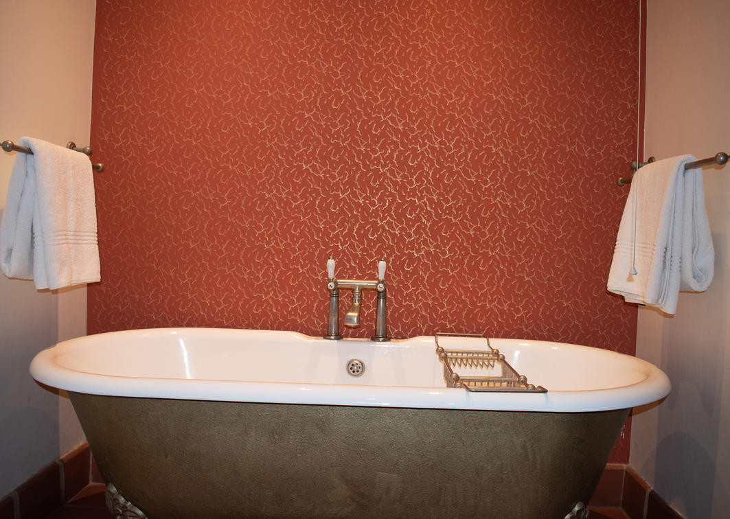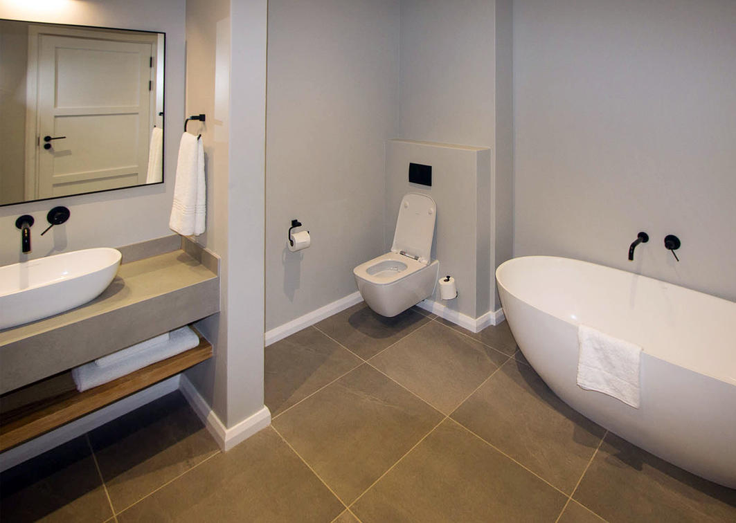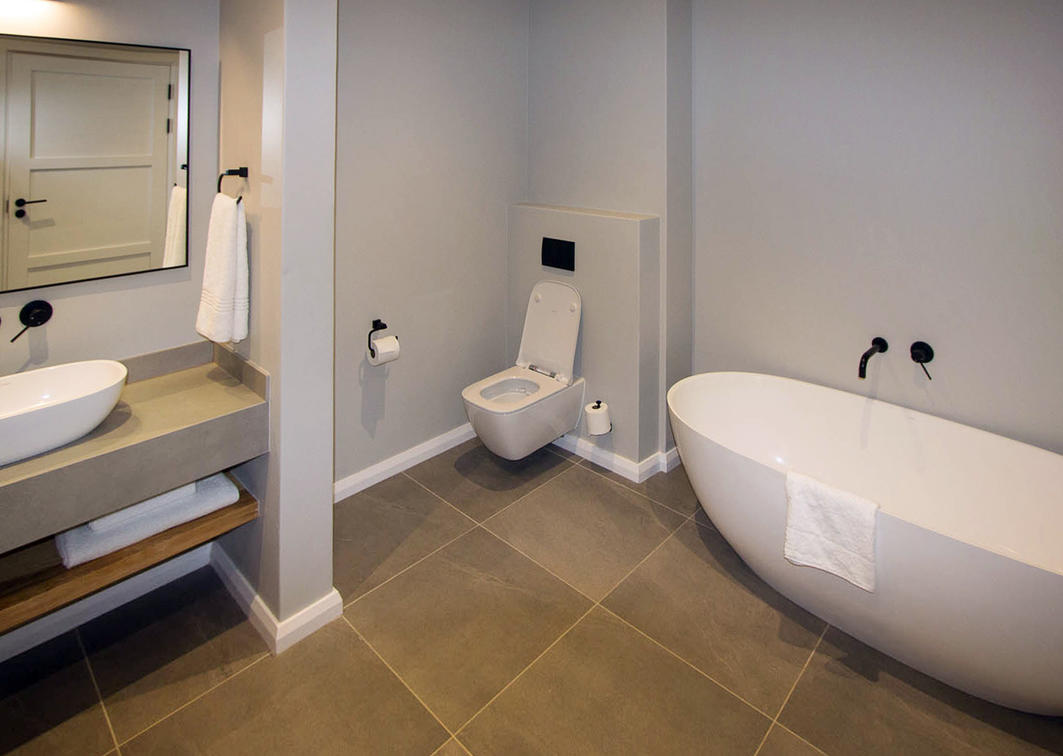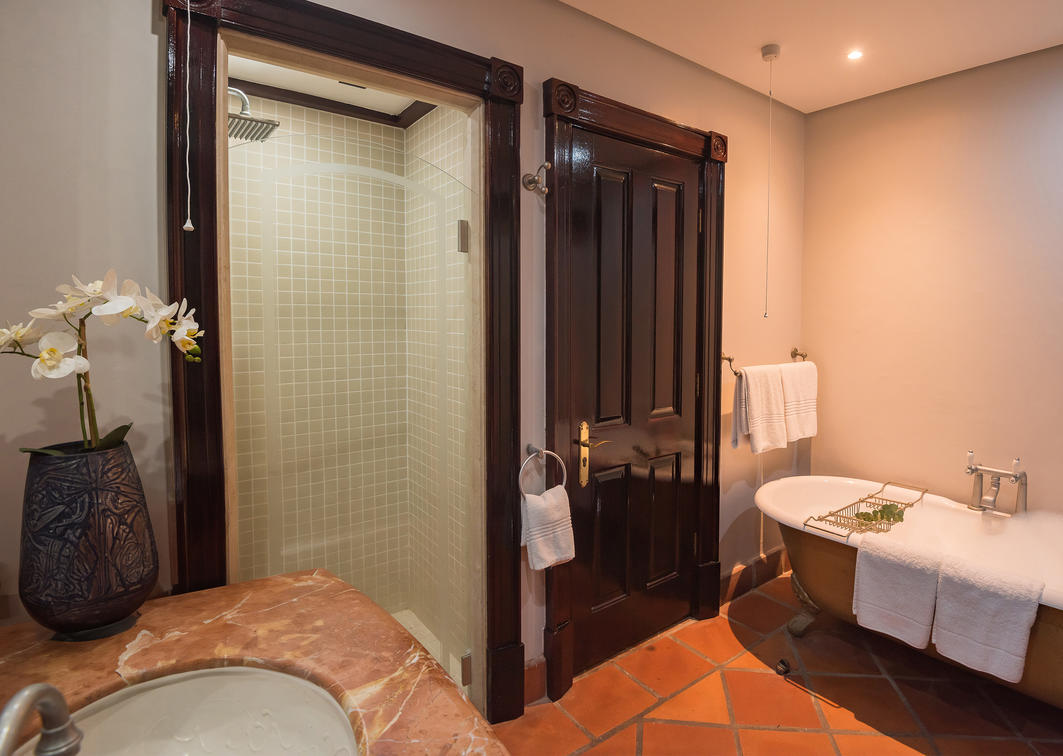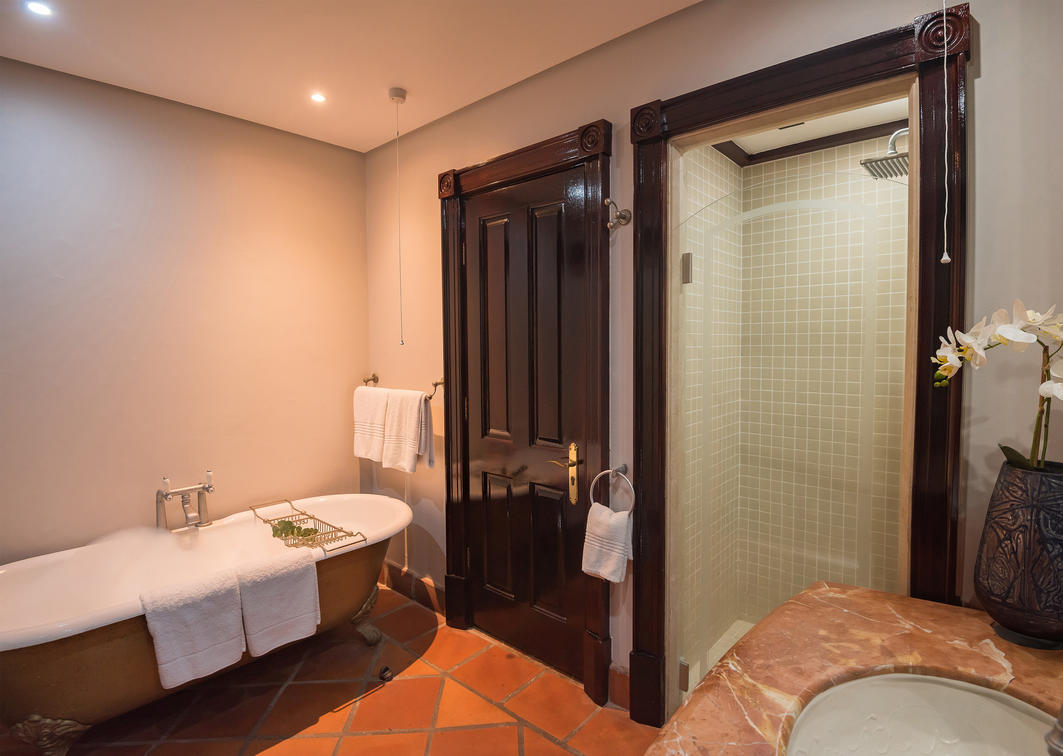 Bedroom with a king-size bed and en suite bathroom with bath and shower