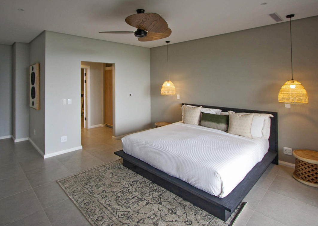 Master bedroom with king-size bed and en suite bathroom with bath and shower