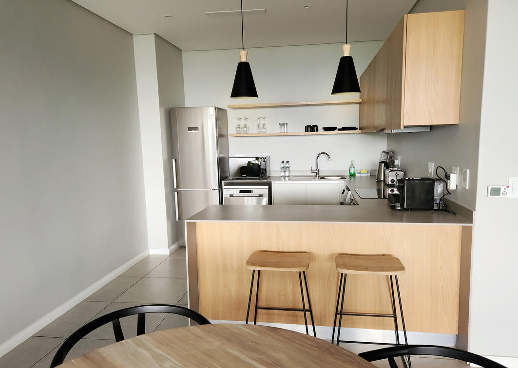 Open plan lounge with kitchenette (fridge/freezer, microwave, dishwasher, stove with oven, washing machine)