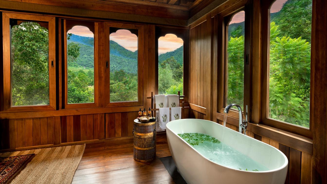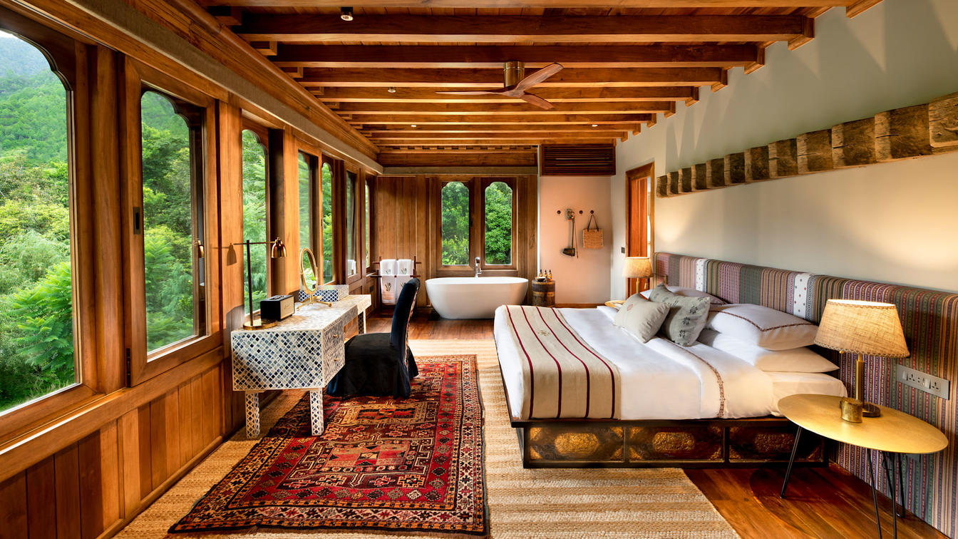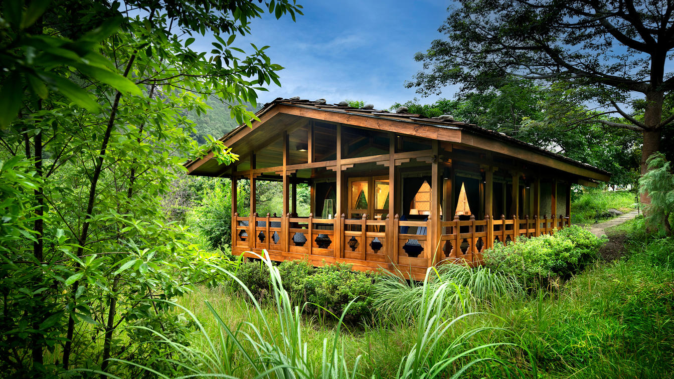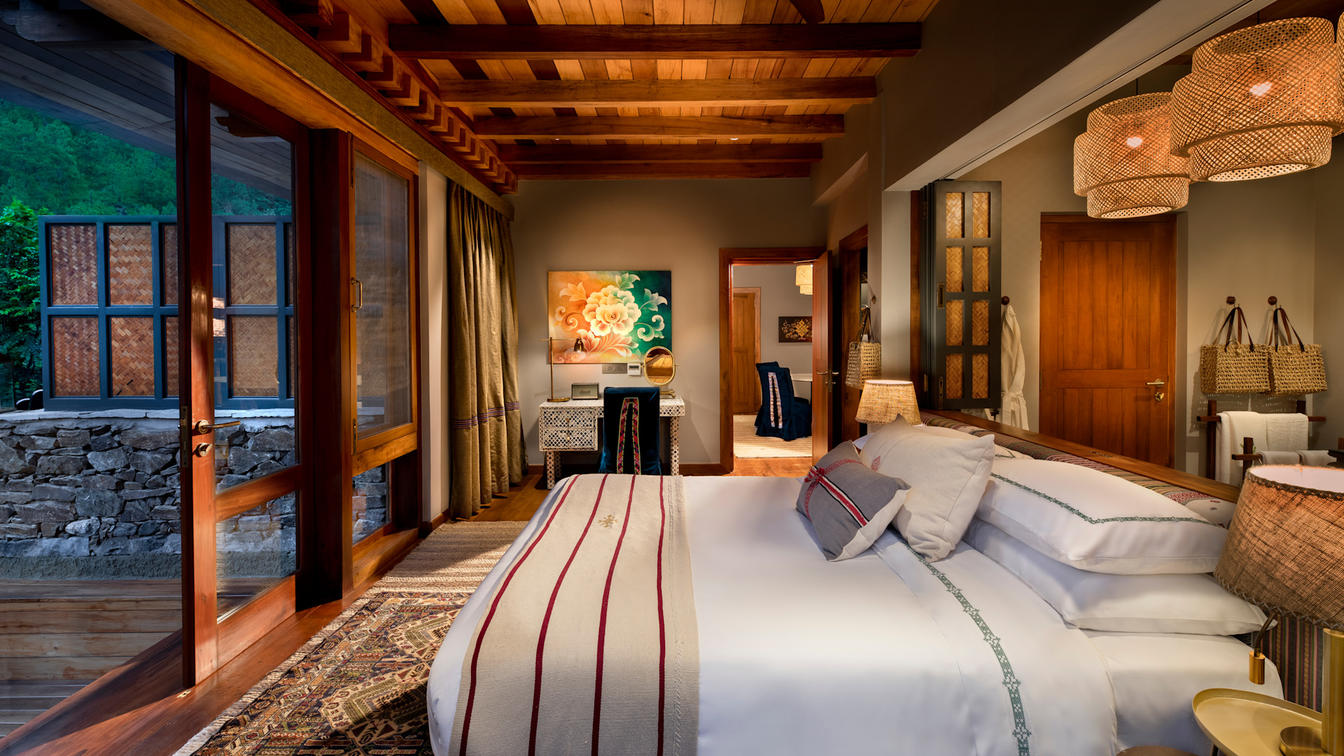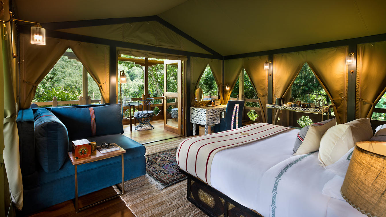 Six safari-style Tented Suites are delicately suspended from a traditional Bhutanese timber structure, blending seamlessly into the natural surrounds. Cleverly positioned to ensure the utmost privacy, each suite features an ensuite bathroom with an indoor and outdoor shower plus a star bath, and a private verandah.