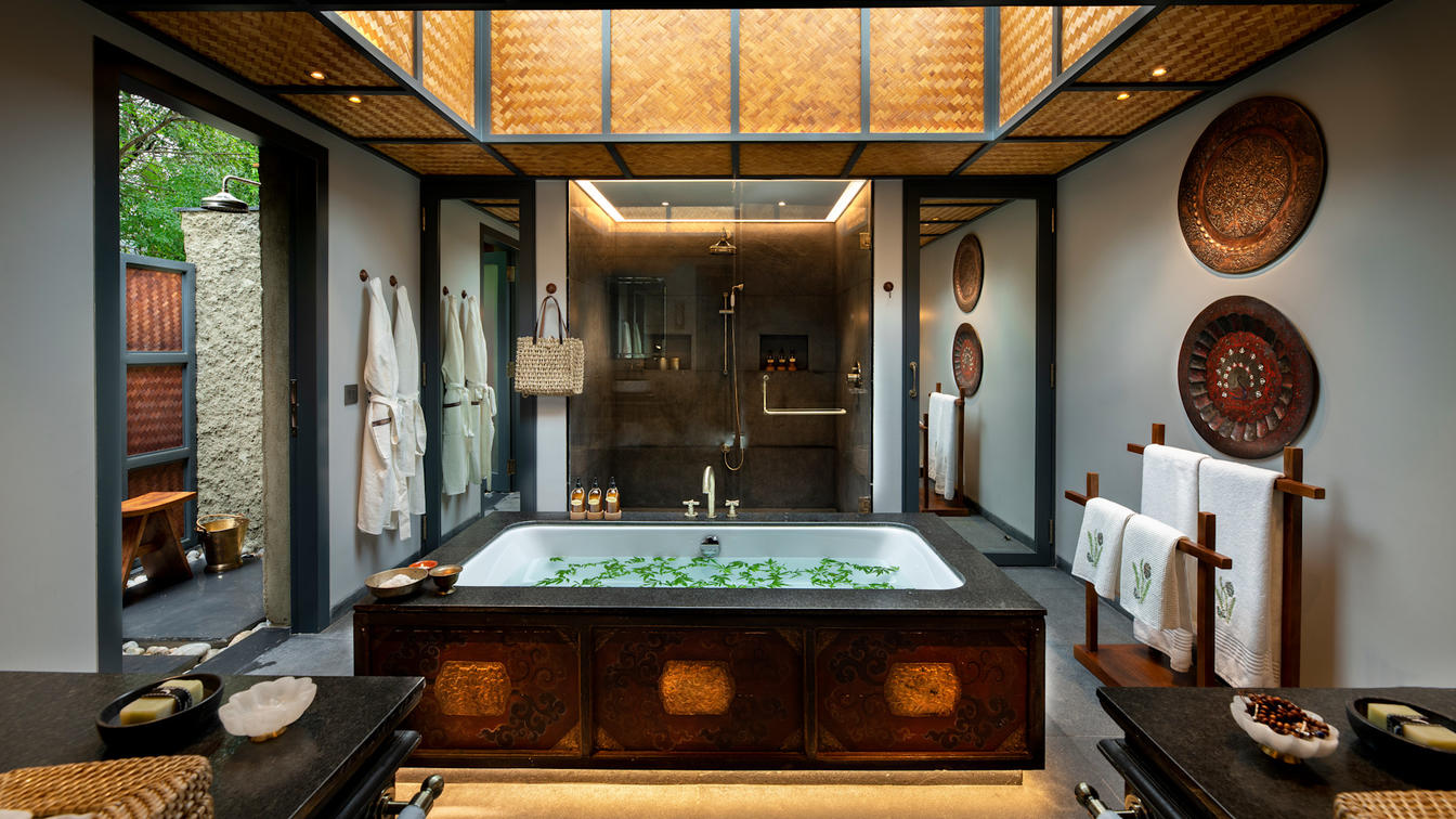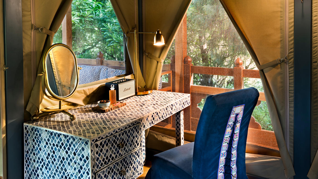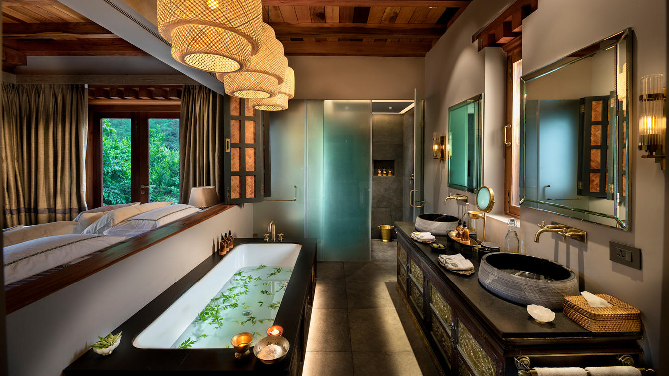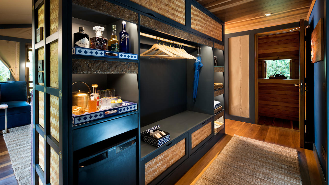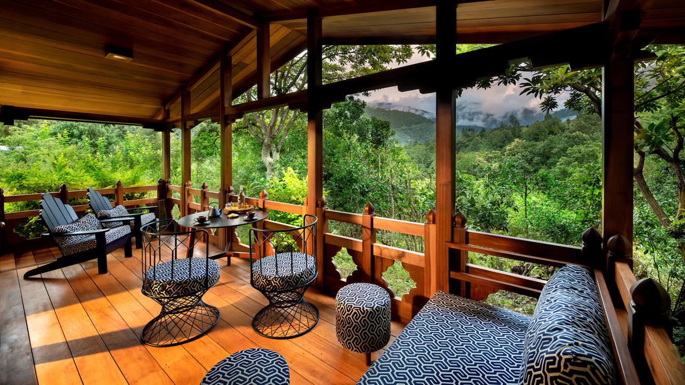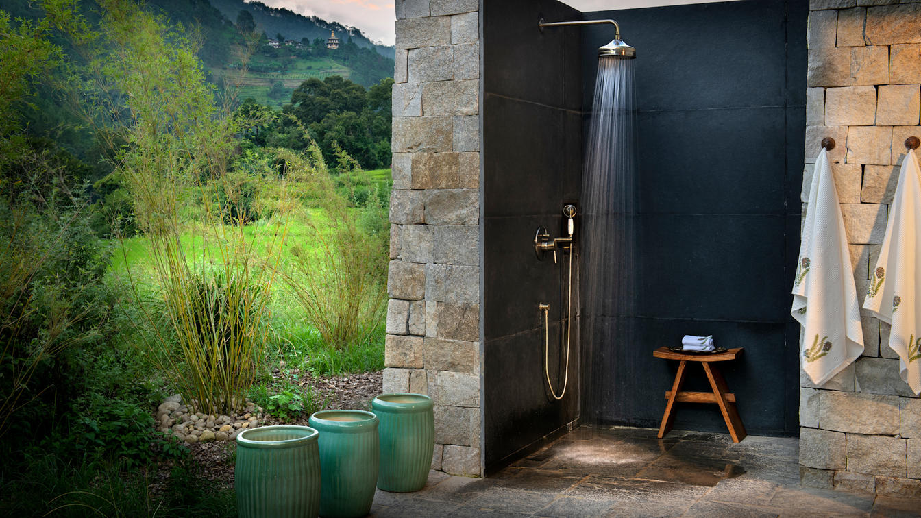 Six safari-style Tented Suites are delicately suspended from a traditional Bhutanese timber structure, blending seamlessly into the natural surrounds. Cleverly positioned to ensure the utmost privacy, each suite features an ensuite bathroom with an indoor and outdoor shower plus a star bath, and a private verandah.