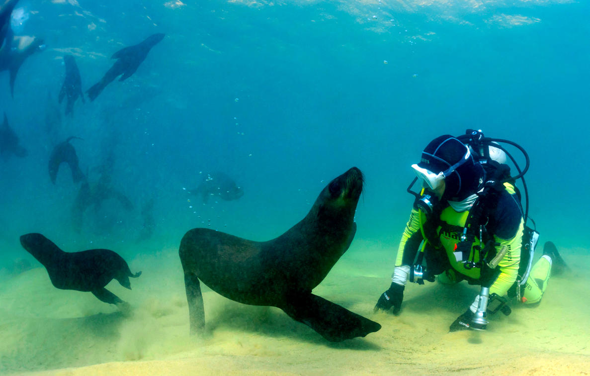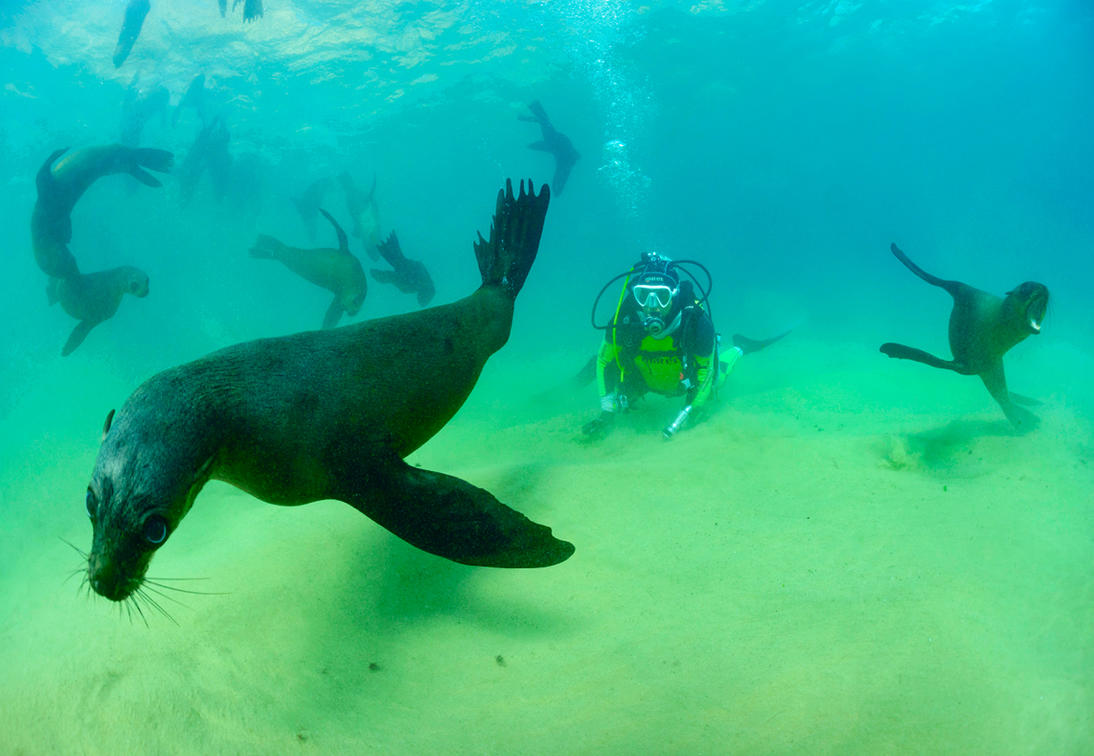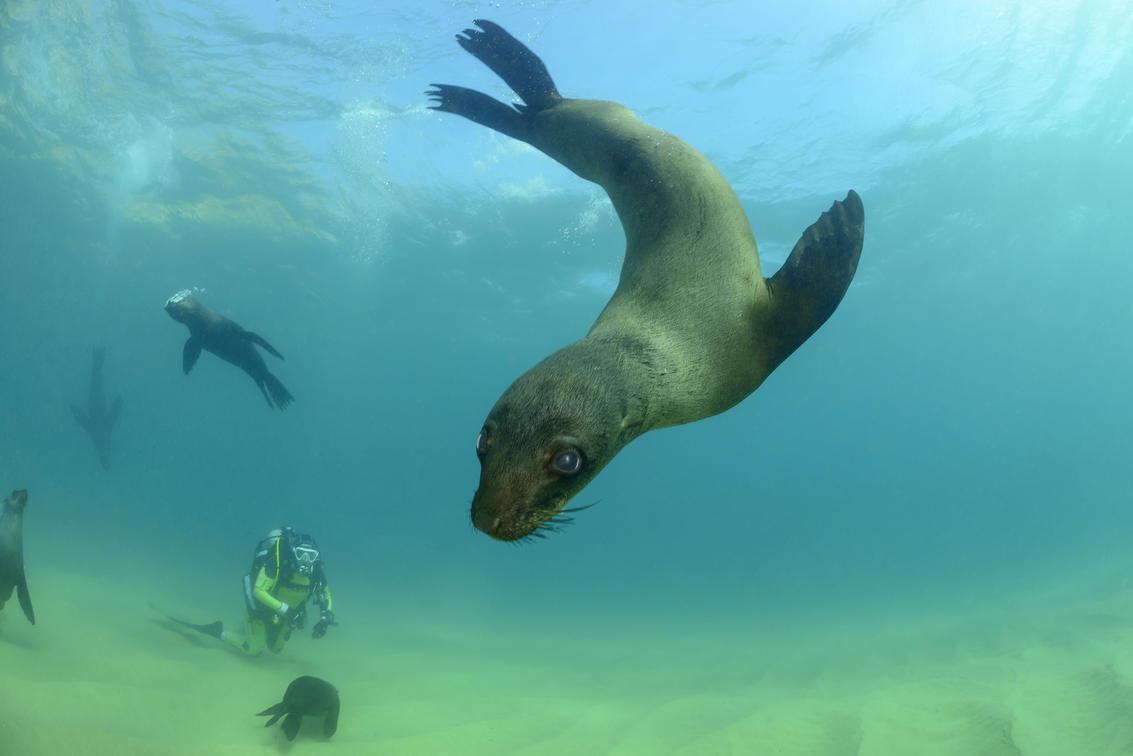 Seals, so ungainly on land, are transformed into the most graceful creatures once they enter the water. Their large, intelligent eyes follow the divers as they swim playfully amongst them, blowing bubbles & moving in for a closer look – this is a once in a lifetime diving encounter!