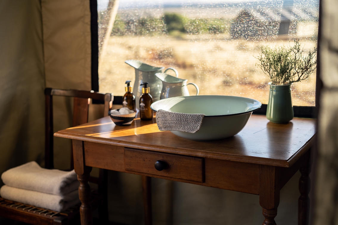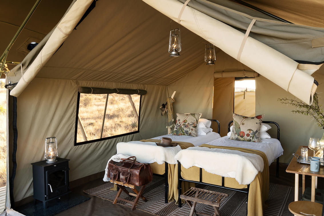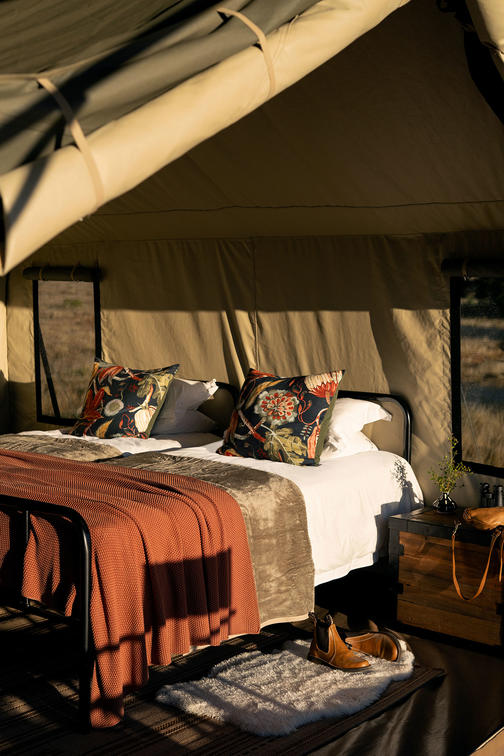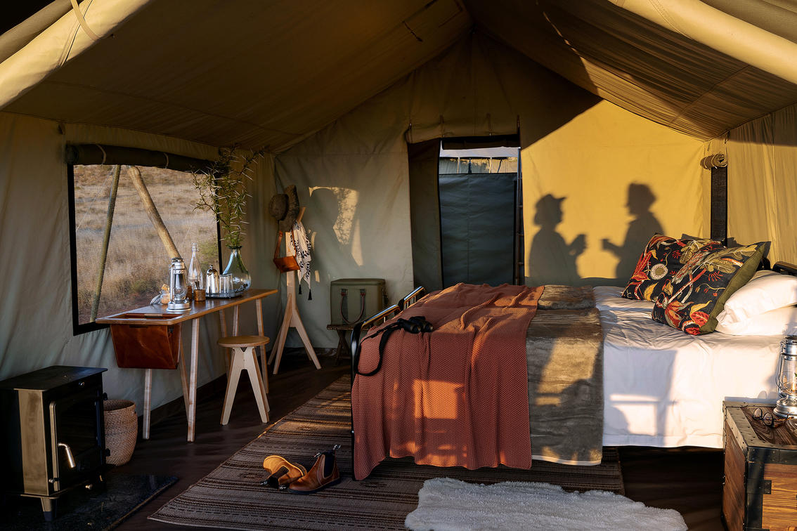 Exclusive-use of Plains Camp including four tented suites, communal mess tent, as well as private vehicle, guide & chef. Each Tented Suite comprises a bedroom, en-suite bathroom, outdoor shower, fireplace and seating area. Plains Camp sleeps up to 8 guests.