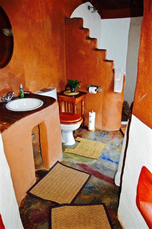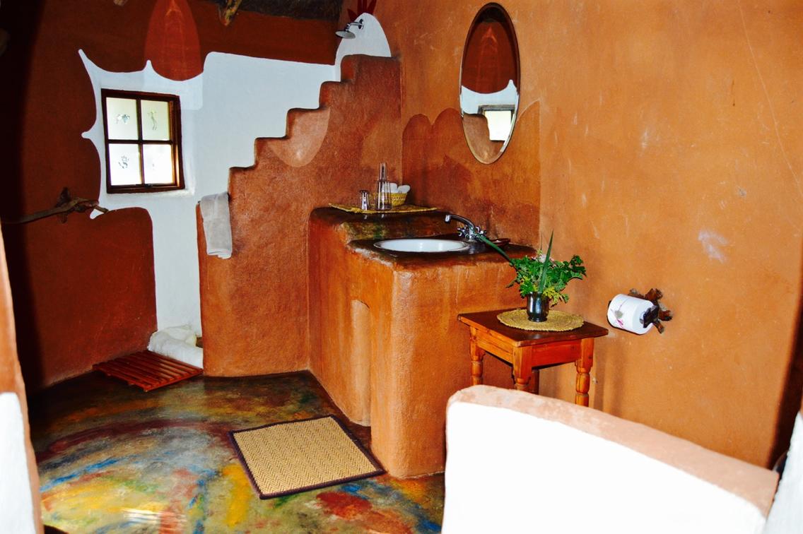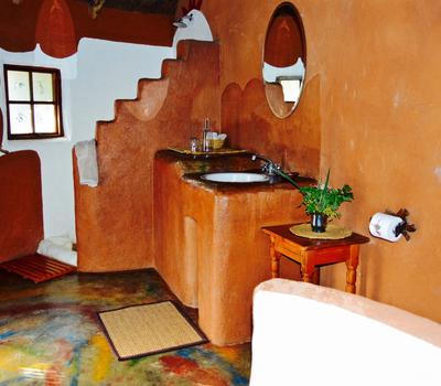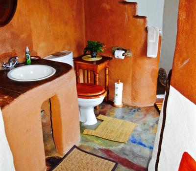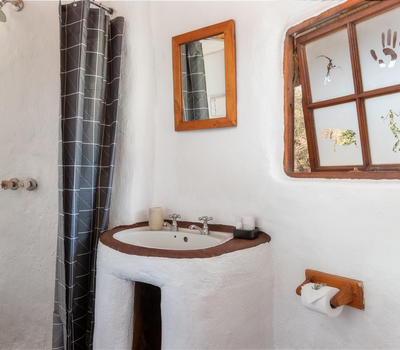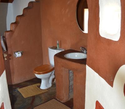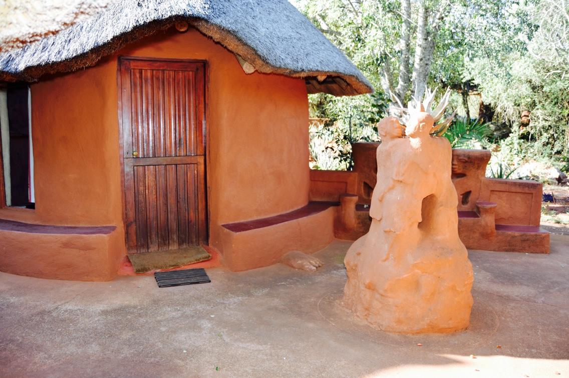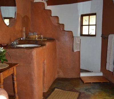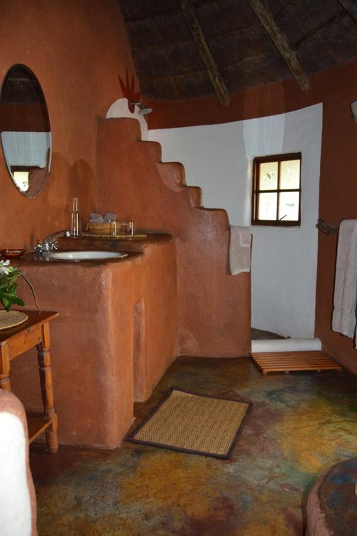 Wild Plum- African style hut interconnected by courtyards in eco-friendly lodge.Dine in thatched lapa overlooking the valley.Wooden deck & pool.Outdoor bathroom with oval stone bath & sculpted indoor & outdoor showers. Suitable for pilot/guide/child.
