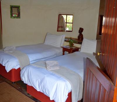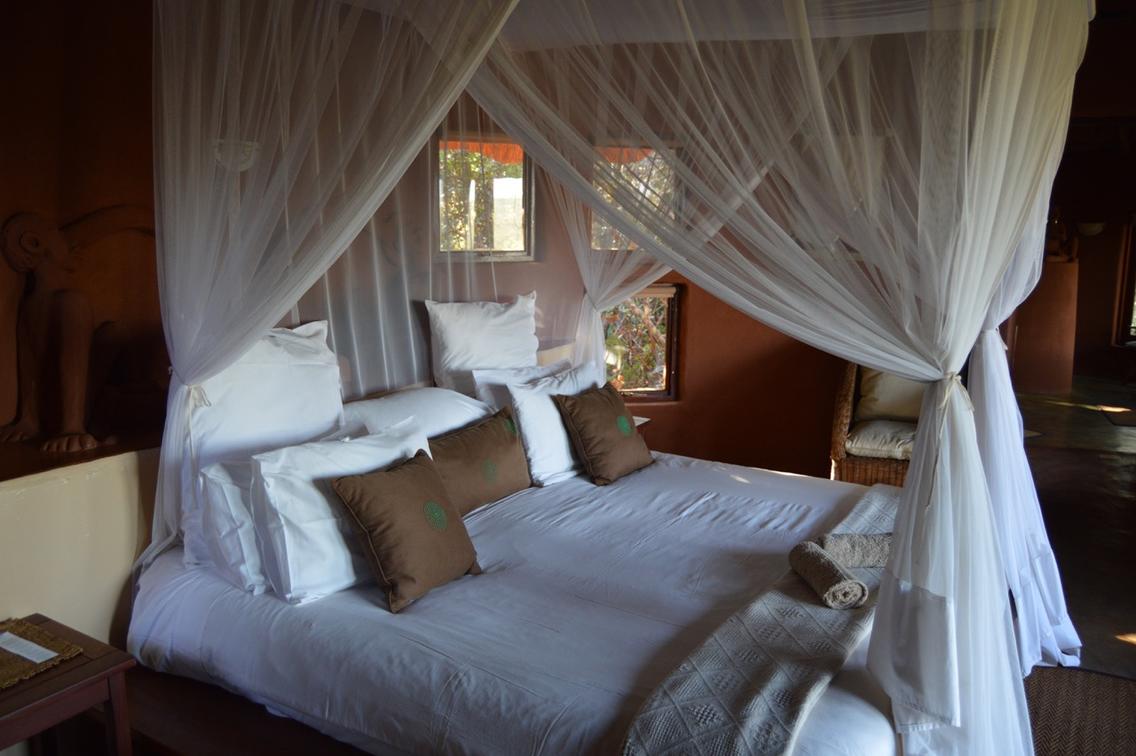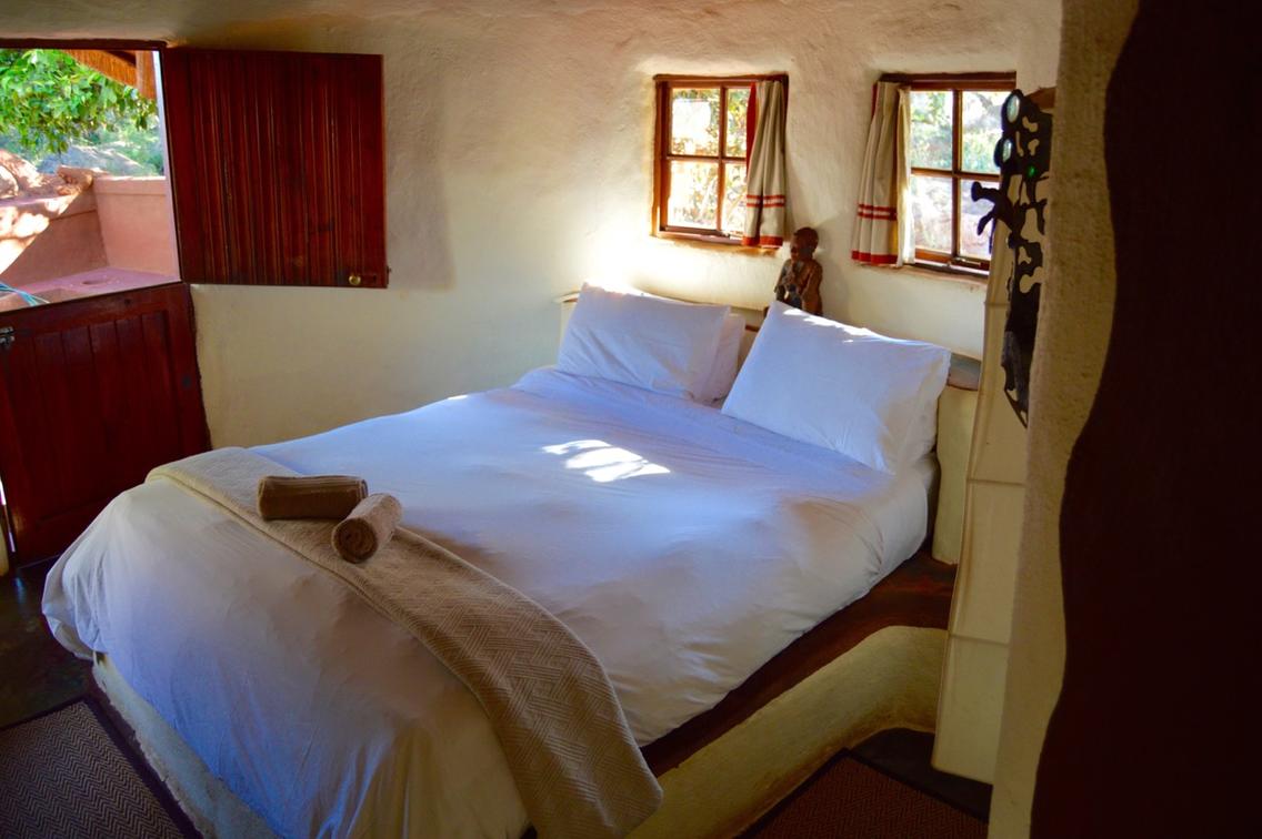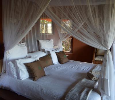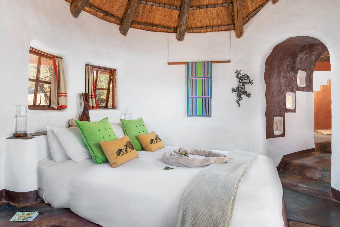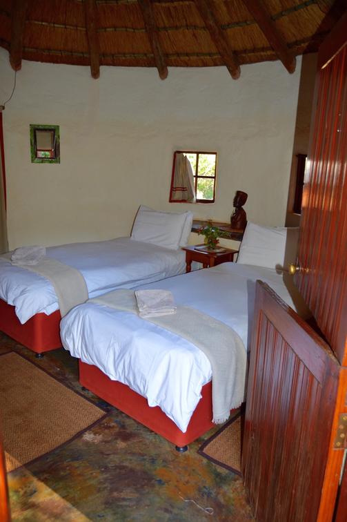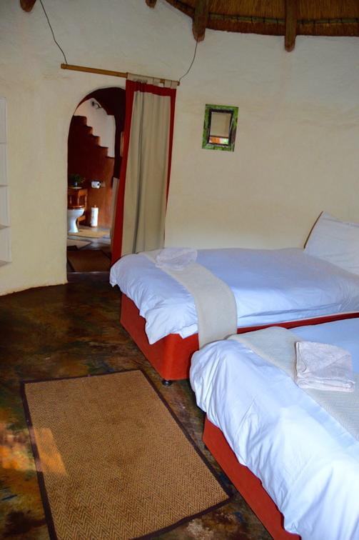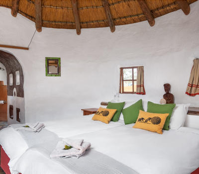 This African style hut is a standard room in the Lodge. The bedroom has 2 single beds which can be changed to make up a king & has an en-suite bathroom with shower & toilet. Access to a luxury outdoor bathroom hut stone bath & outdoor shower,pool & deck.