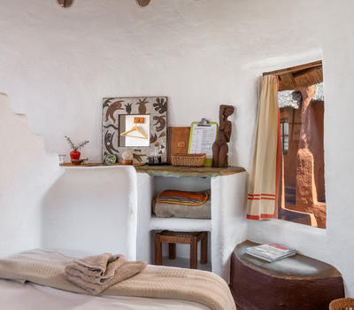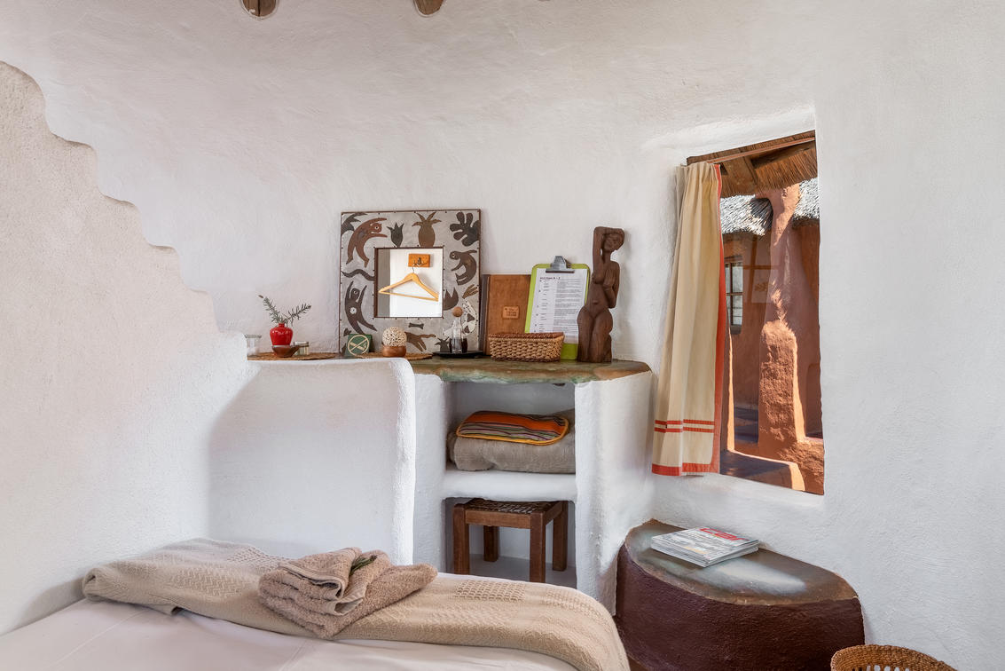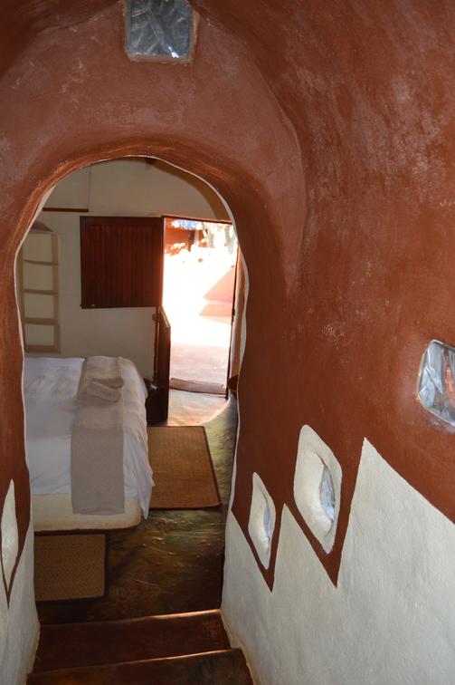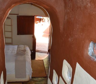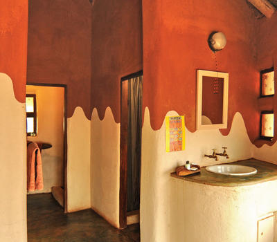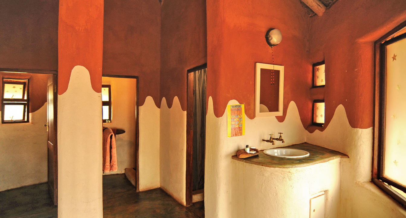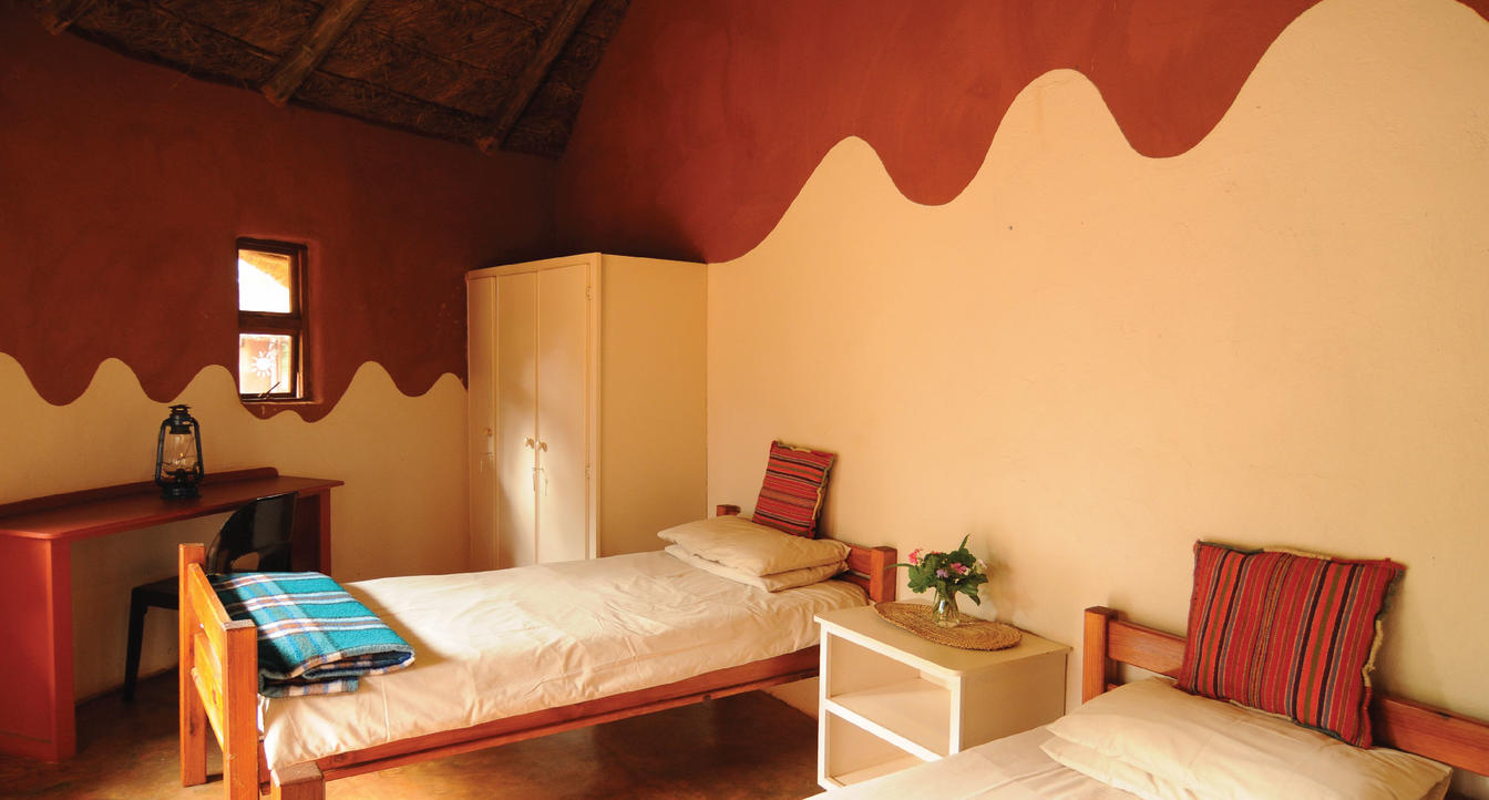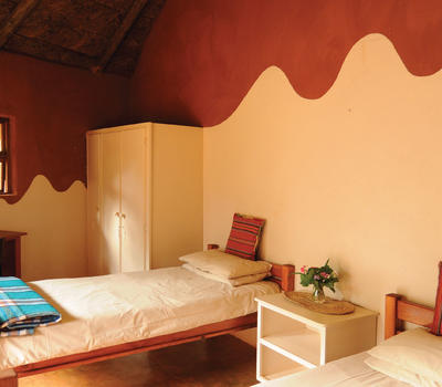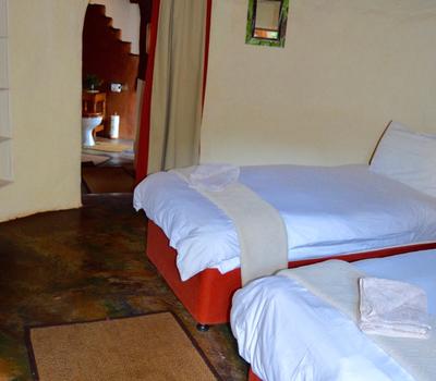 This African style hut is a standard room in the Lodge. The bedroom has 2 single beds which can be changed to make up a king & has an en-suite bathroom with shower & toilet. Access to a luxury outdoor bathroom hut stone bath & outdoor shower,pool & deck.