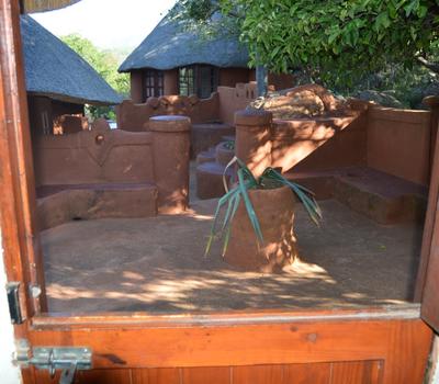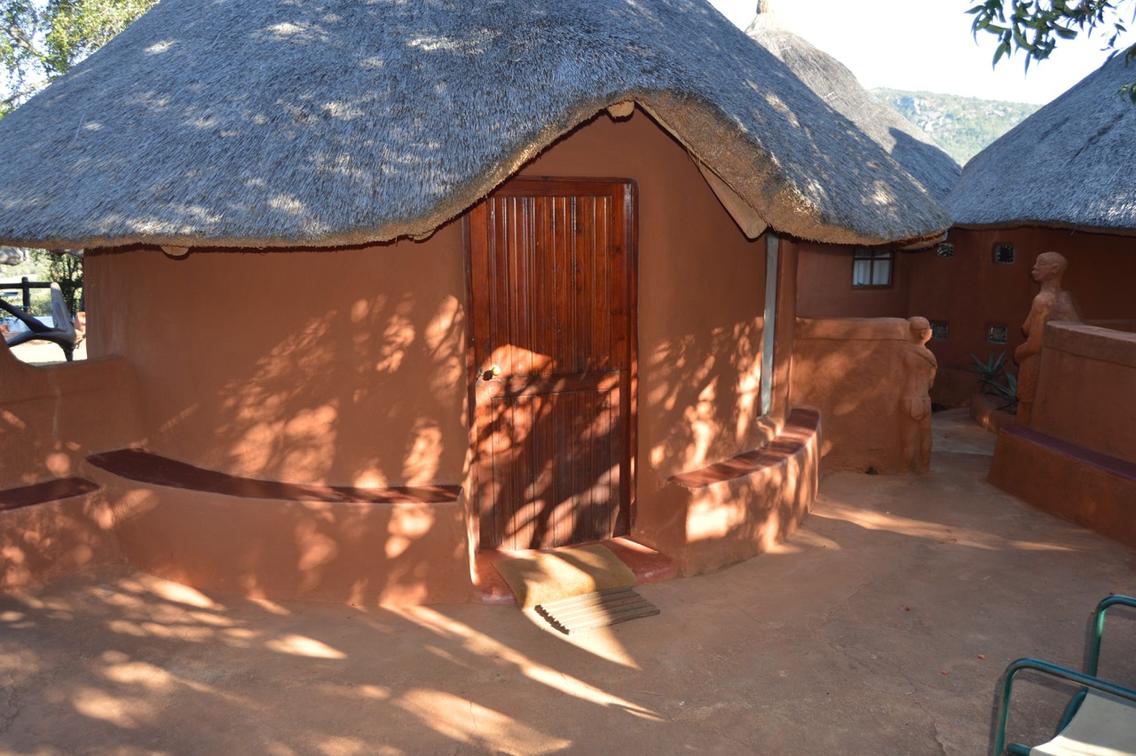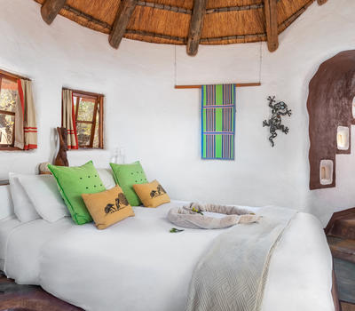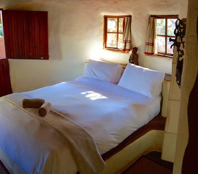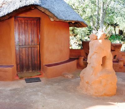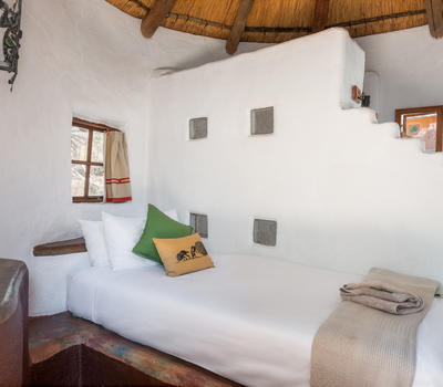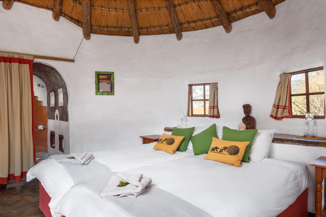 This African style hut is a standard room in the Venda Village Lodge.The bedroom is furnished with a queen-size bed & has an en-suite bathroom with shower & toilet. Access to a luxury outdoor bathroom hut with large stone bath & outdoor shower,pool & deck