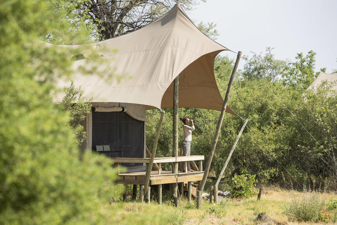 Sand pathways access elevated and well-spaced tents with views over the Khwai River floodplain into Moremi Game Reserve. Each tent has a front deck offering seating and a place to put up your feet while enjoying the bush and wildlife.