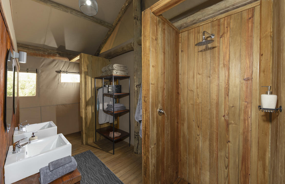 The tent is furnished with a desk with a charging station and drinks tray, armchair, luggage rack and bedside tables with reading lights. Beds can be either twin or king, face the view through expansive front windows, and are draped with Mosquito netting with an overhead fan.