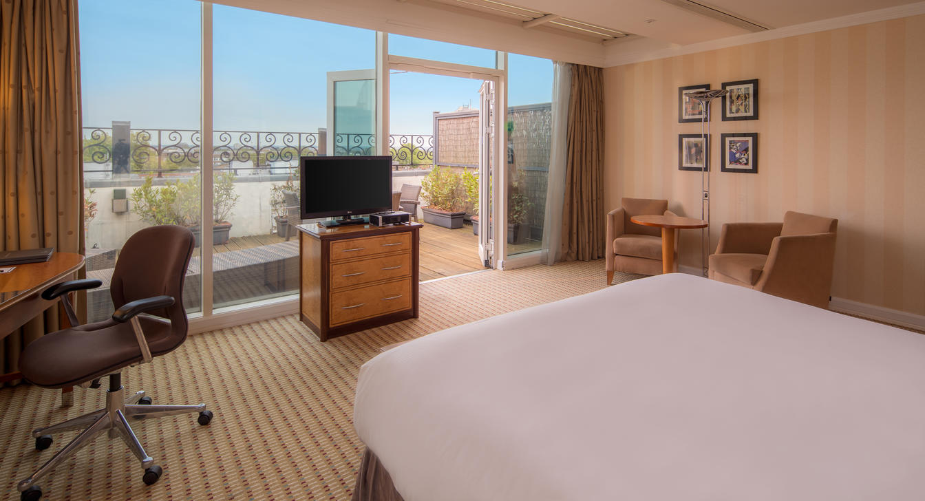 Treat yourself to this spacious Queen Hilton Suite. This Art Deco-style suite has a separate living room with a sofa bed, comfortable to sleep two children, and a private bedroom with a Queen bed.