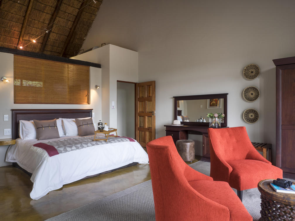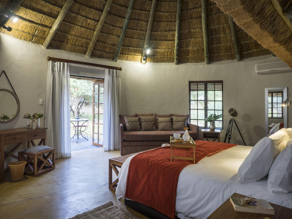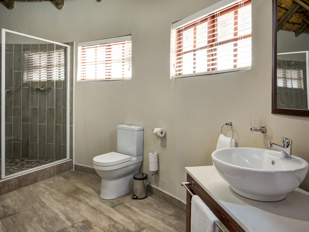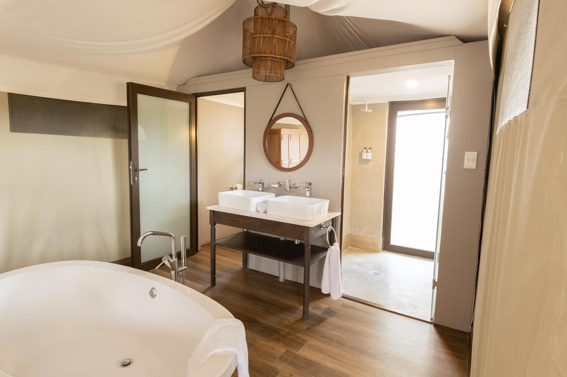 Each bush chalet consists of 2 twin beds that can be combined as a king-size bed and two ensuite bathrooms equipped with a bath and a shower