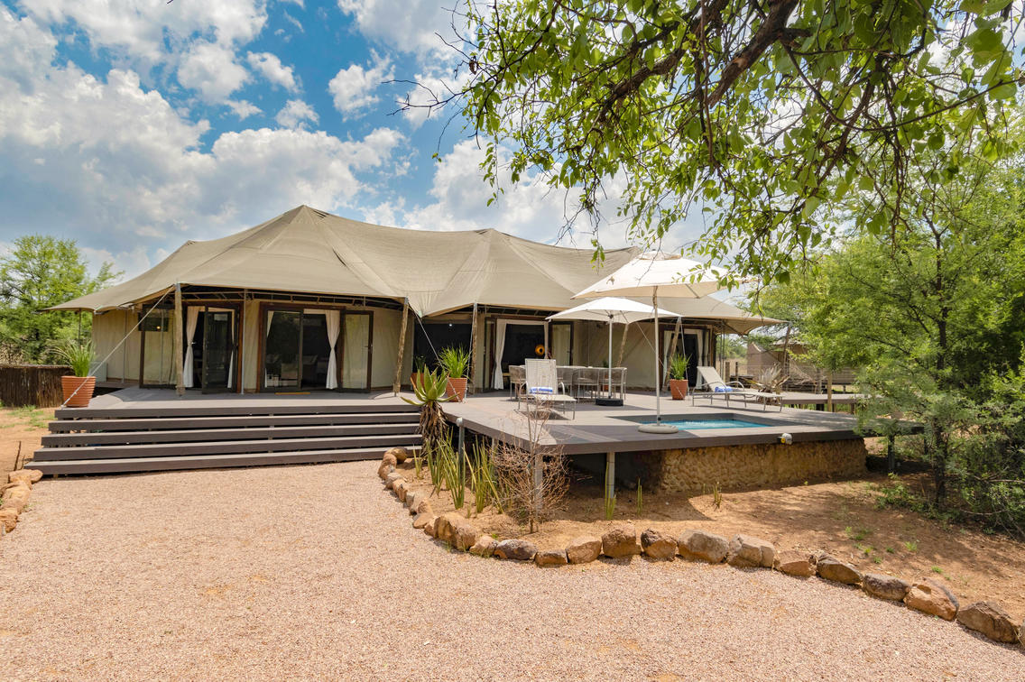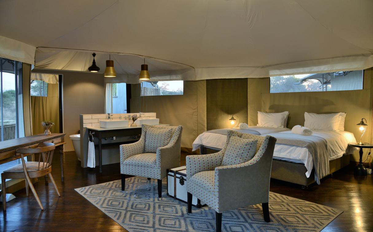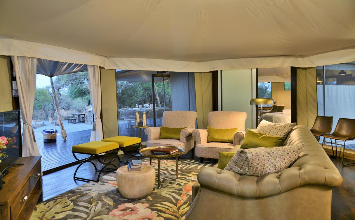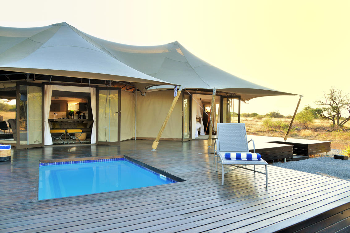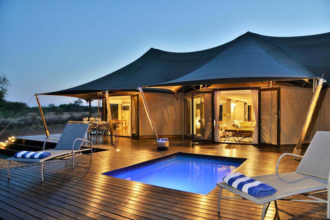 There is no skimping on space, as each luxury tent includes two bedrooms, two bathrooms, a fully equipped kitchen, an open plan lounge and dining area as well as a timber viewing deck. The bedrooms incorporate an authentic outdoor shower, while each luxury-tented safari camp features a medium-sized private swimming pool and a private boma braai area.