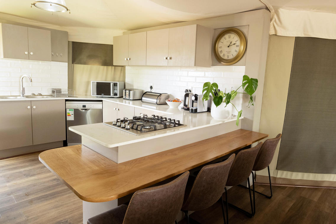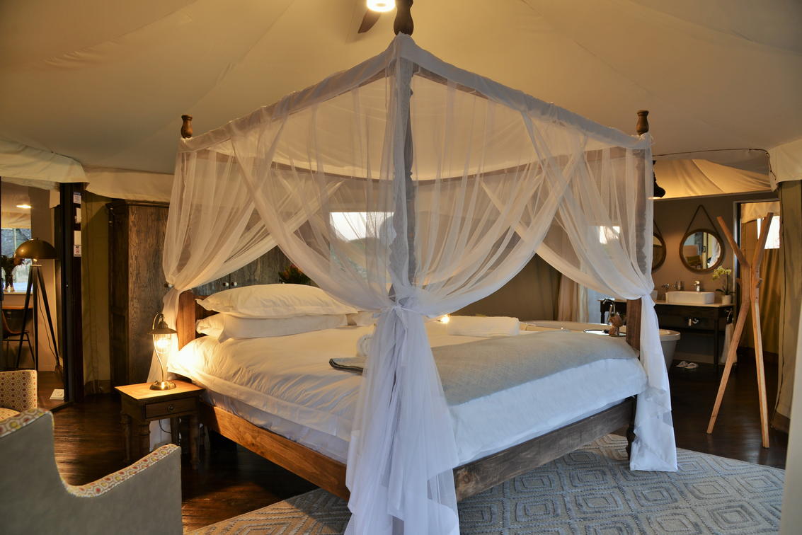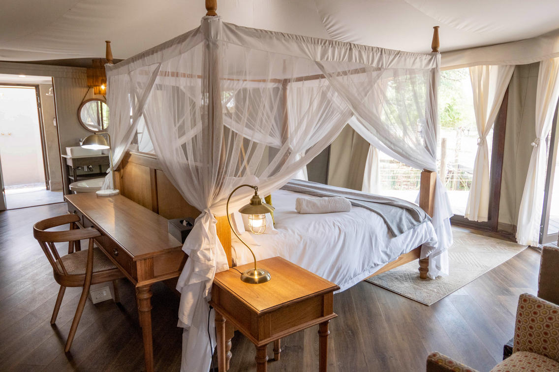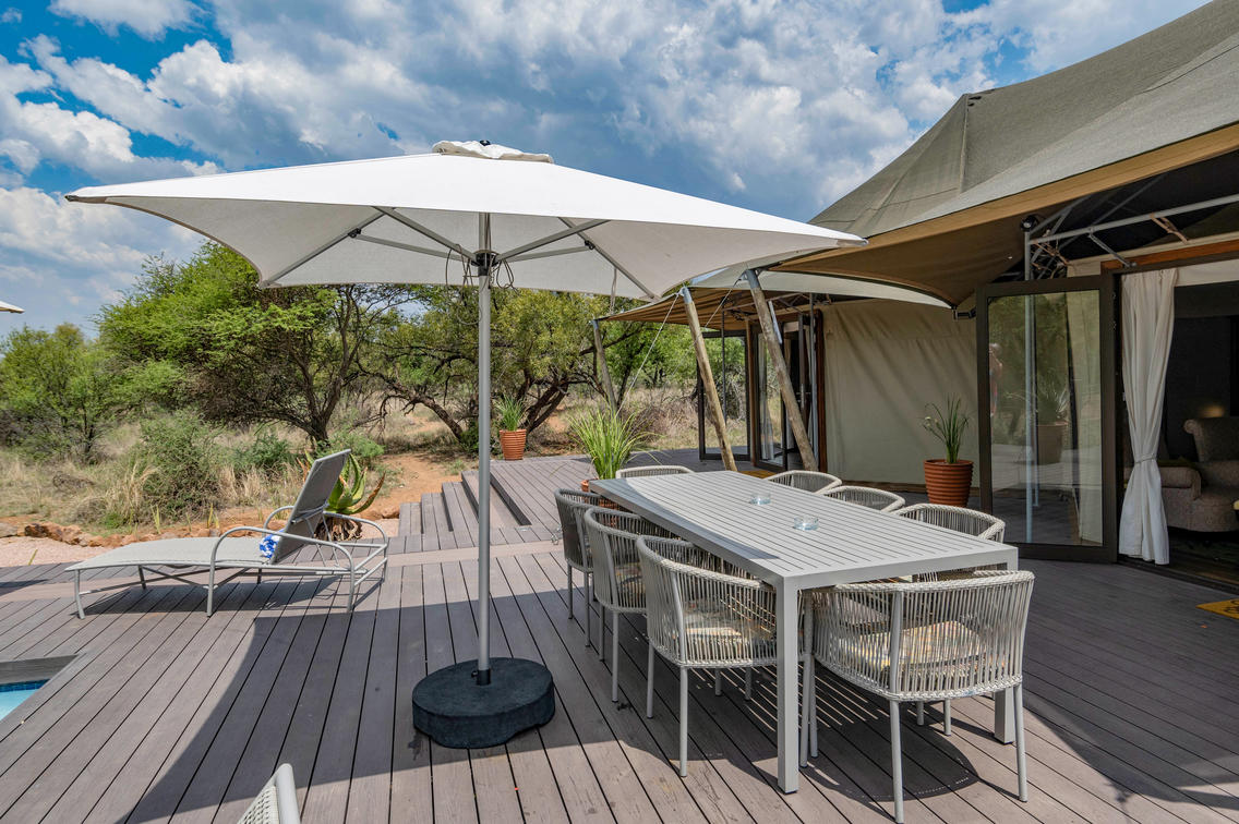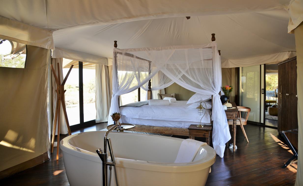 There is no skimping on space, as each luxury tent includes two bedrooms, two bathrooms, a fully equipped kitchen, an open plan lounge and dining area as well as a timber viewing deck. The bedrooms incorporate an authentic outdoor shower, while each luxury-tented safari camp features a medium-sized private swimming pool and a private boma braai area.