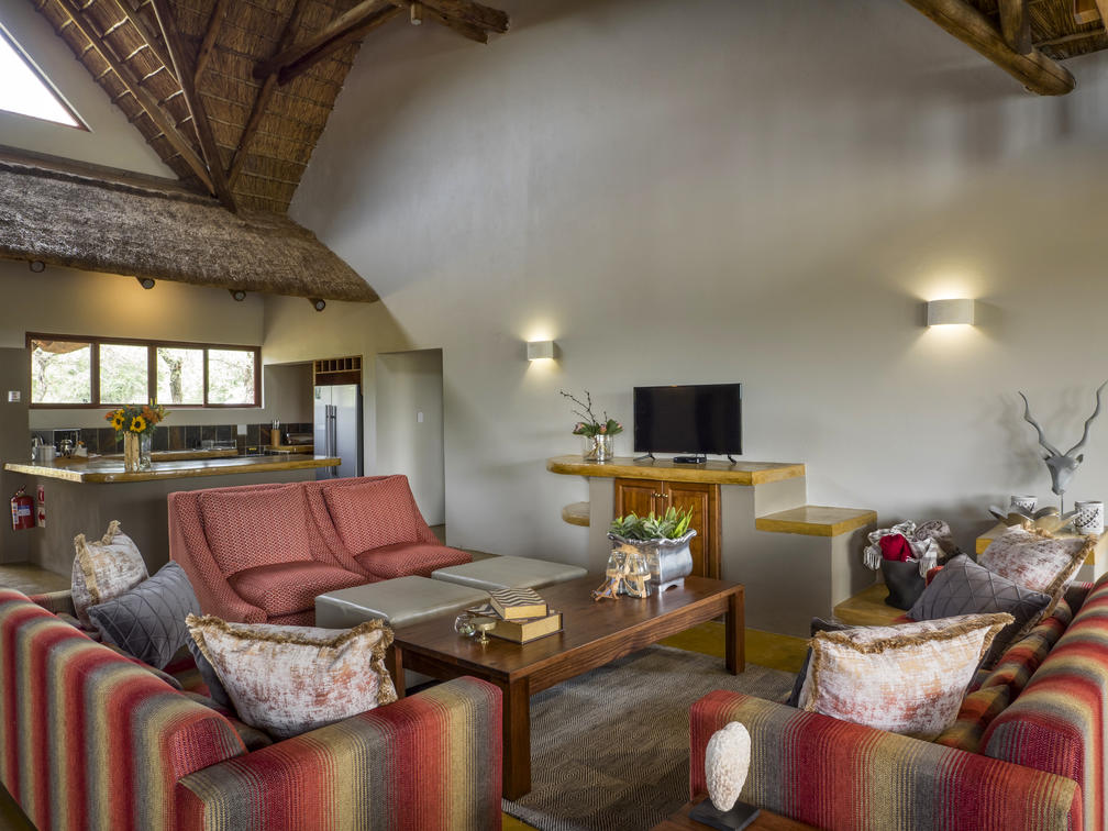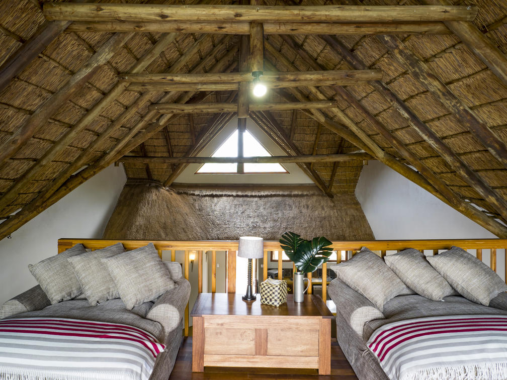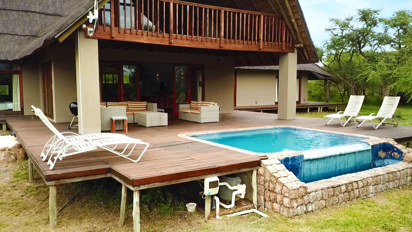The luxury self-catering villas at Finfoot Lake Reserve offer spacious holiday living with a large open plan fully equipped kitchen, lounge and dining room area which opens up onto a wooden wrap-around deck which has a medium-sized private pool and a braai area. Above the lounge area, there is a loft with a timber deck overlooking the dam.