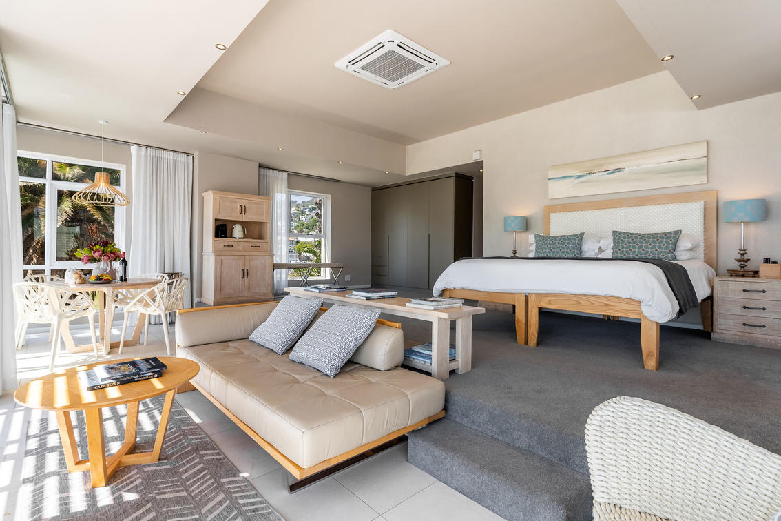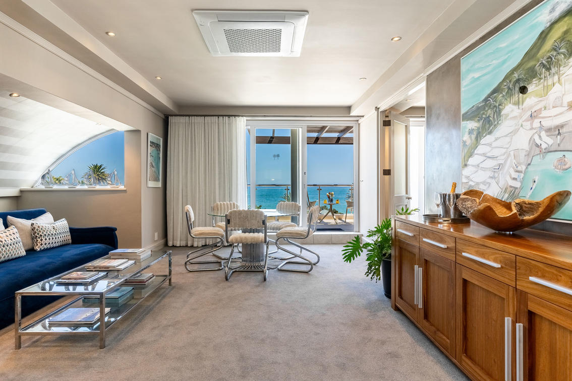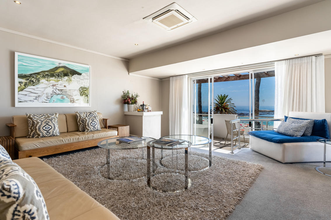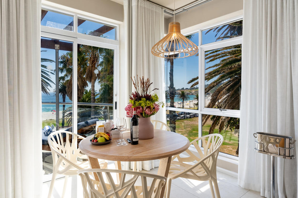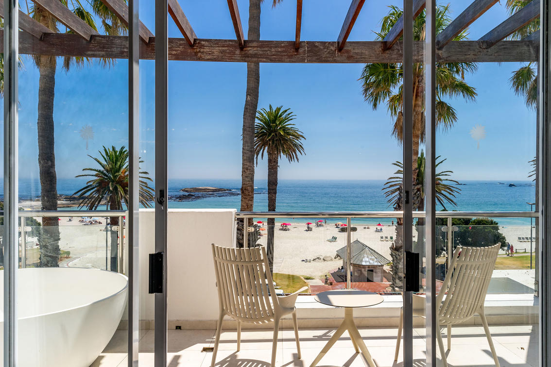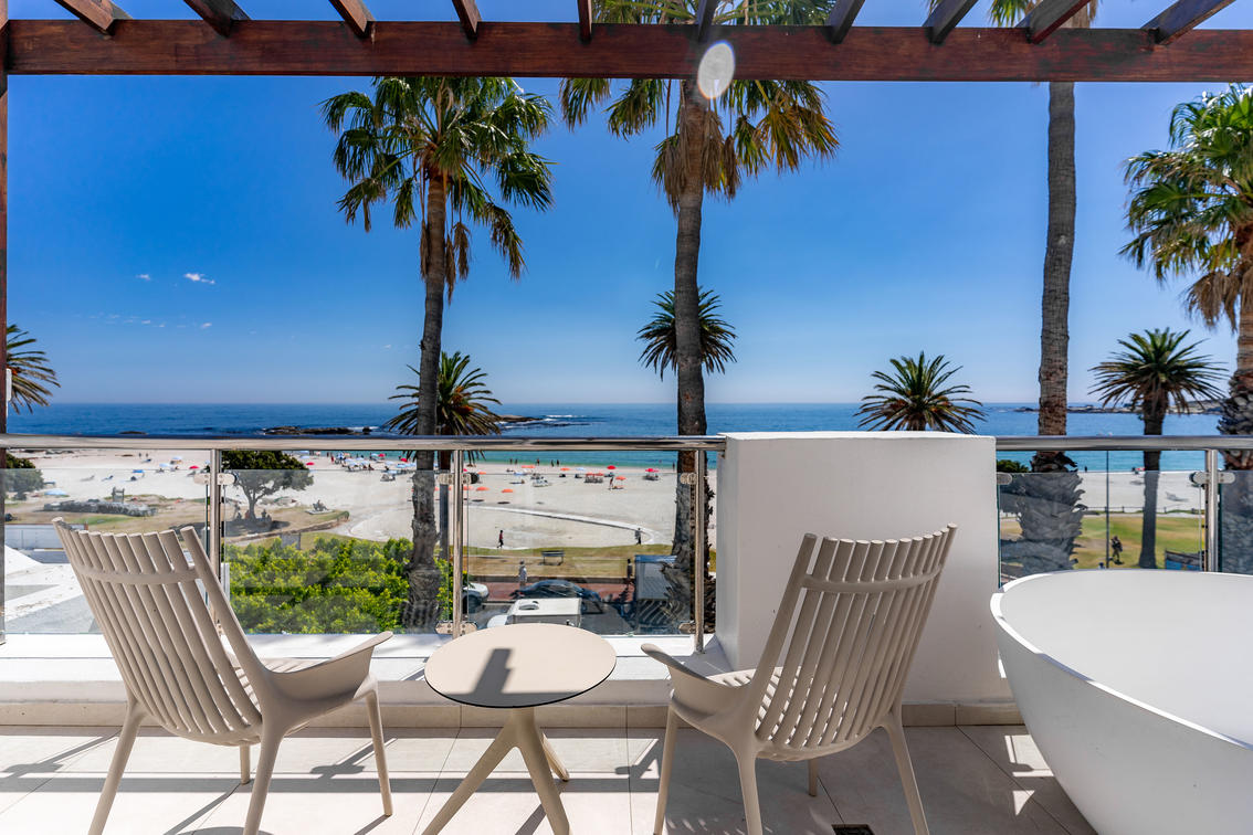 Spacious interior with dining area, lounge, and views of the beach, sea and Lion's Head. Features a balcony with romantic outdoor bath
