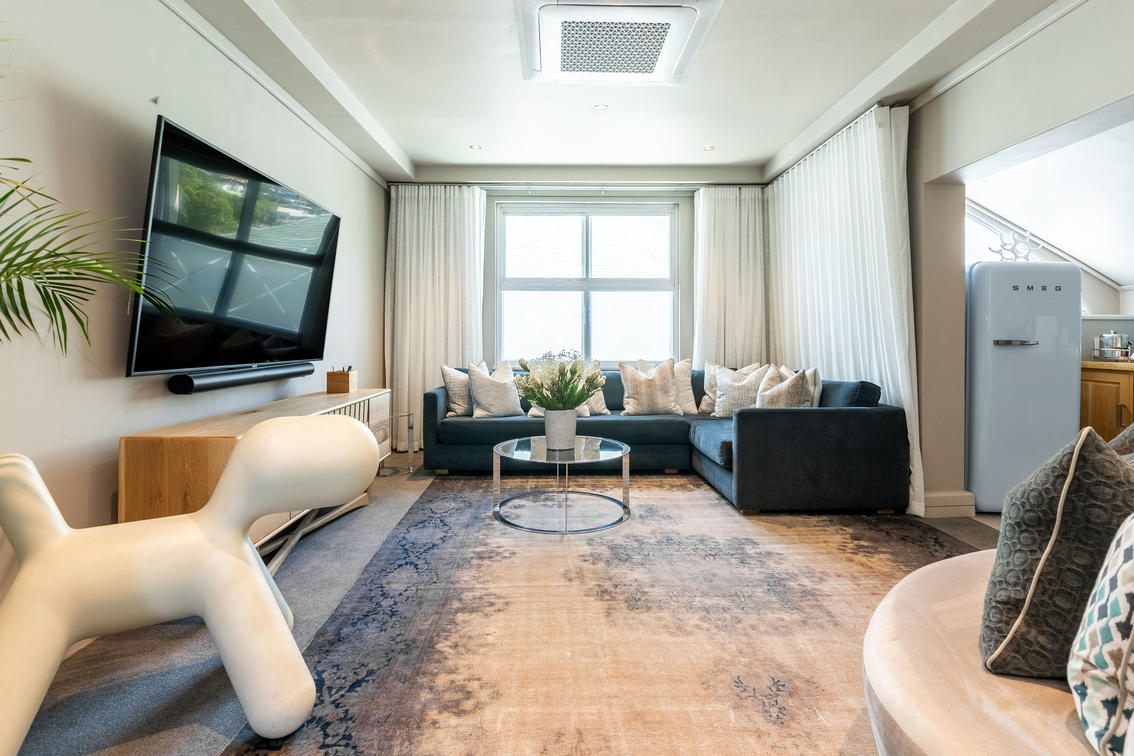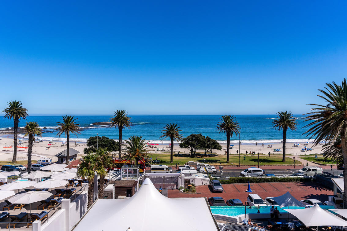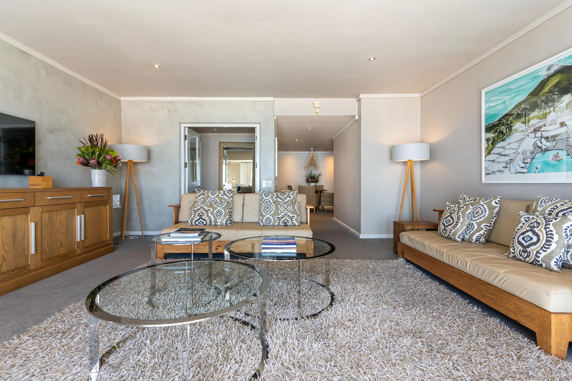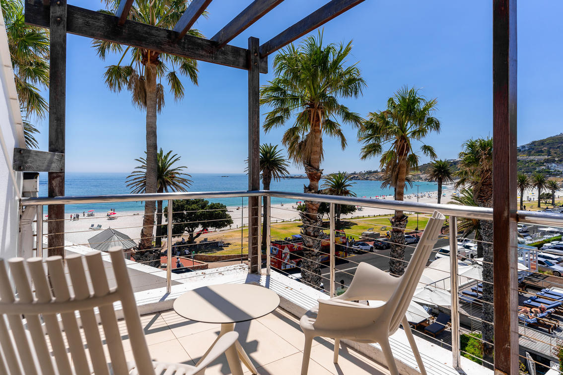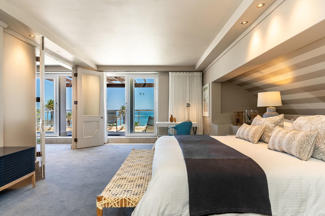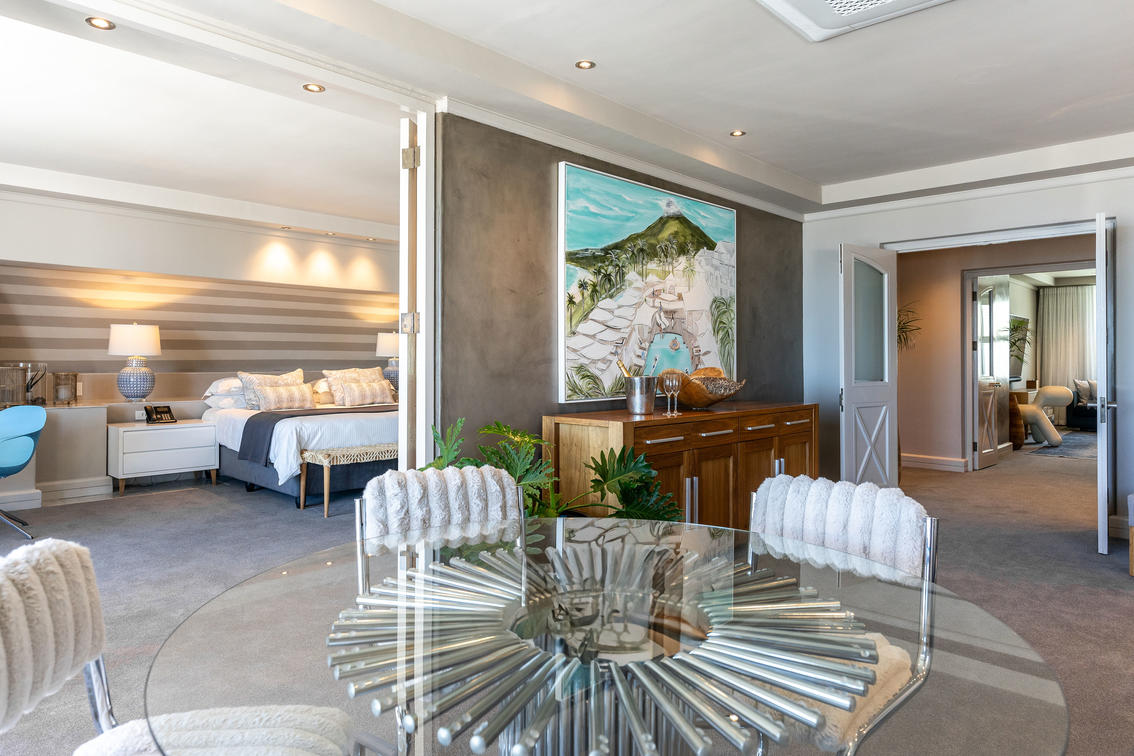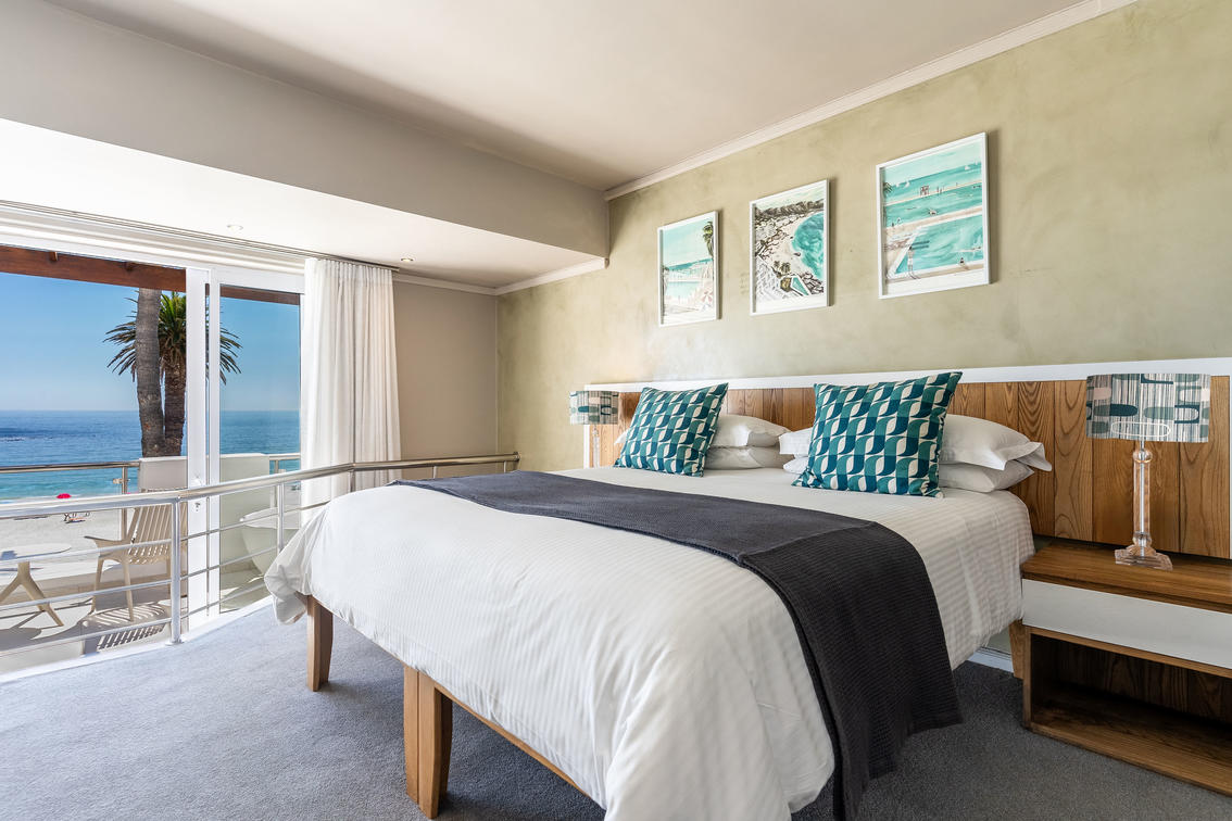 Spacious interior with dining area, lounge, and views of the beach, sea and Lion's Head. Features a balcony with romantic outdoor bath