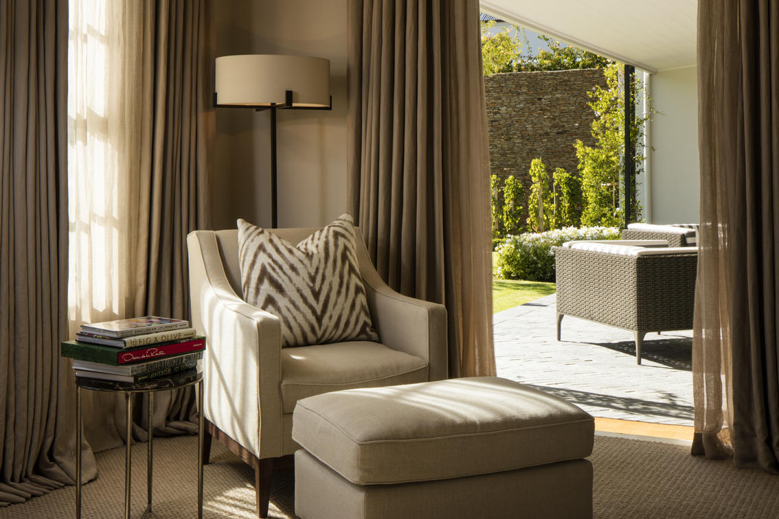 A size of 85m²/914ft², Vineyard Cottage with its own magnificent terrace and private plunge pool overlooking the manicured vineyards, offers easy access to Leeu Spa by Healing Earth & Gym. The cottage, which affords views of landscaped gardens and a mountain backdrop, comprises two rooms and a shared lounge with fireplace.