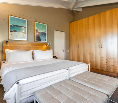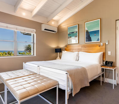 This light and spacious master bedroom boasts expansive views of the ocean and The Twelve Apostles