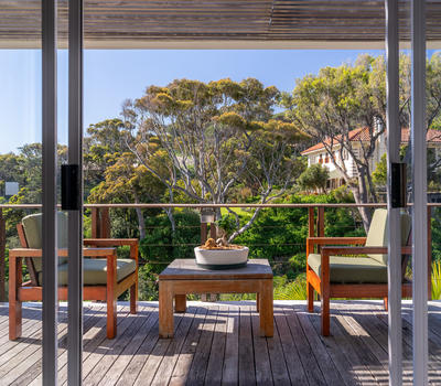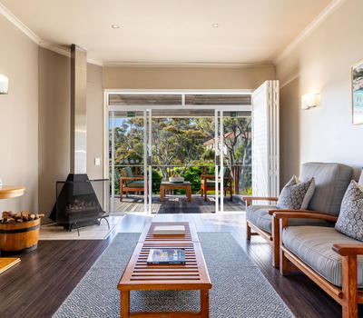 This spacious family suite comprises of 3 bedrooms and 2 bathrooms with decks on either side offering ocean and forest views. The suite features a lounge area with fireplace, dining room area and kitchenette. The bedroom layout offers the choice between double, queen or king bed.