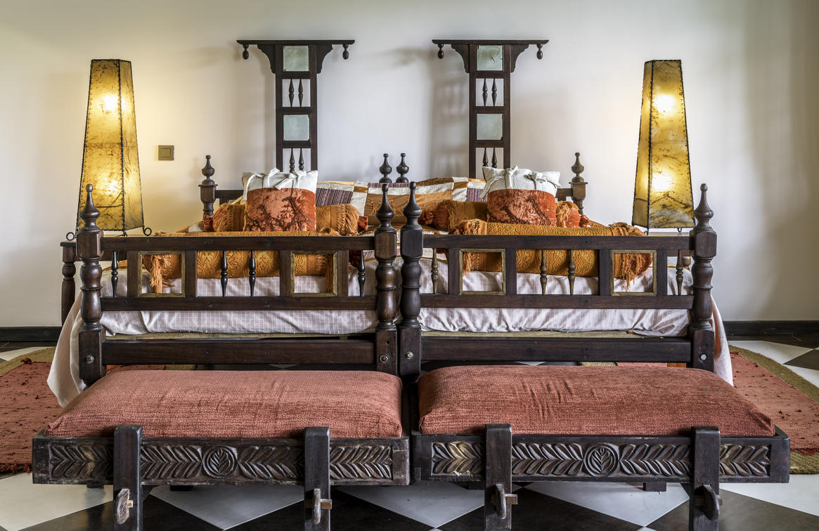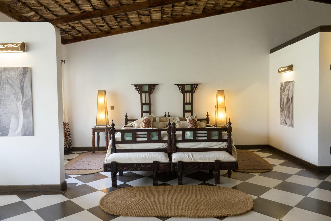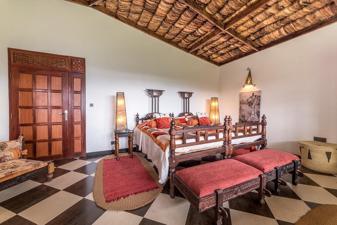 The Deluxe Junior Suite boast a delightful and stylish mix of vibrant elements. Local textiles adorn bright cushions and throws, complemented by brightly patterned Kenyan carpets. The walls are adorned with hand-painted wallpaper featuring vibrant wall art masterfully crafted by talented local artists.