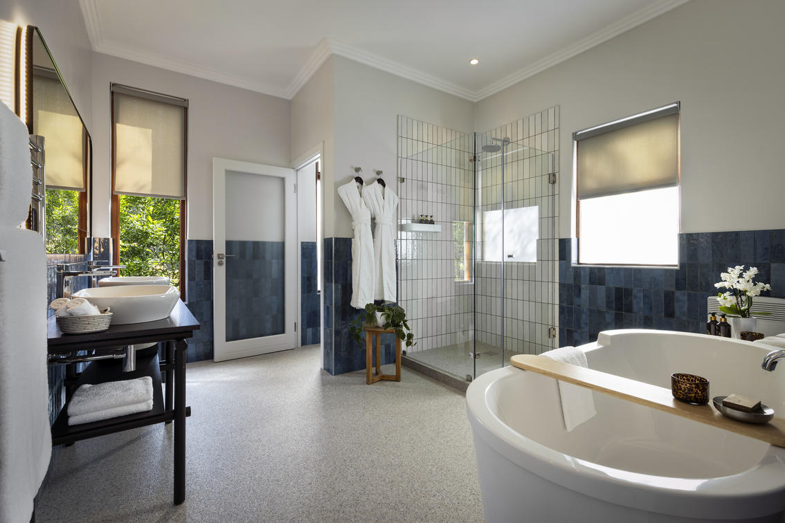 Classic Rooms (45m2) offer ground floor and first floor options, each with either a private terrace or upstairs patio. Opening doors and windows offer guests access to abundant fresh air and natural light – essential when recovering from long-haul travel and adjusting to a new time zone. The Classic Rooms were extensively refurbished in early 2023, and offer gorgeous ensuite bathrooms with both shower and free-standing bath, with luxurious Kalahari amenities. Classic Rooms offer wall-mounted flat-screen TV’s with DSTV, Nespresso machines, kettle, hairdryer, phone charger and adaptors, custom refreshment and work station, designer armchair, chaise lounge with coffee table.