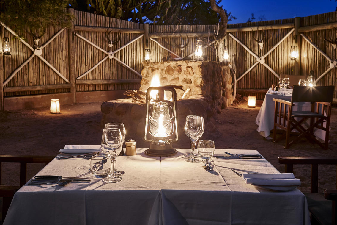 Lanterns and a controlled fire pit set an alluring atmosphere at the private, open-air boma, located at Geiger’s Camp. Indigenous vegetation and African décor further add an inviting touch to this sophisticated dining area, which includes only a handful of tables – each one attractively laid, with great attention to detail.
