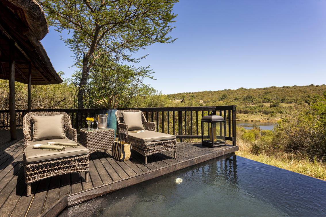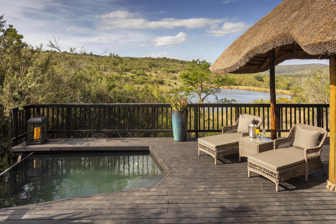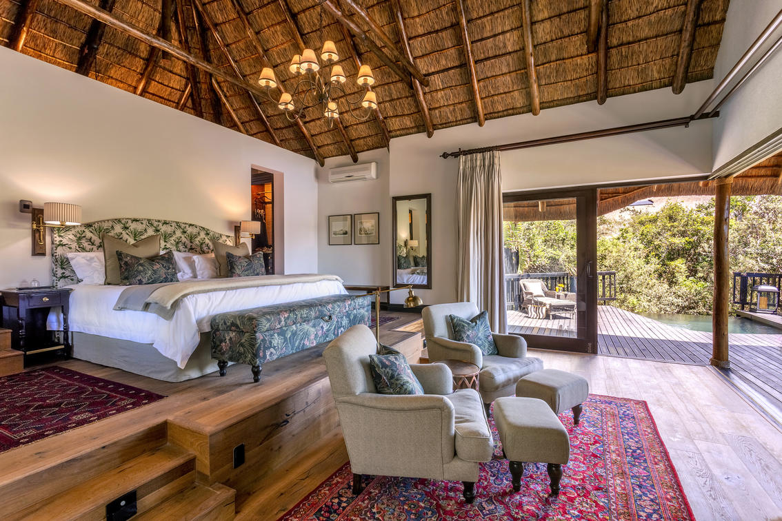 The seven bush-facing suites are decorated in the same luxurious style as the main lodge, with the finest bathroom fittings offering true indulgence—enormous baths, rain shower heads, and his-and-hers basins. Each suite features a private deck with a heated plunge pool and an outdoor shower, all thoughtfully positioned to maximize the sense of being immersed in the bush.
