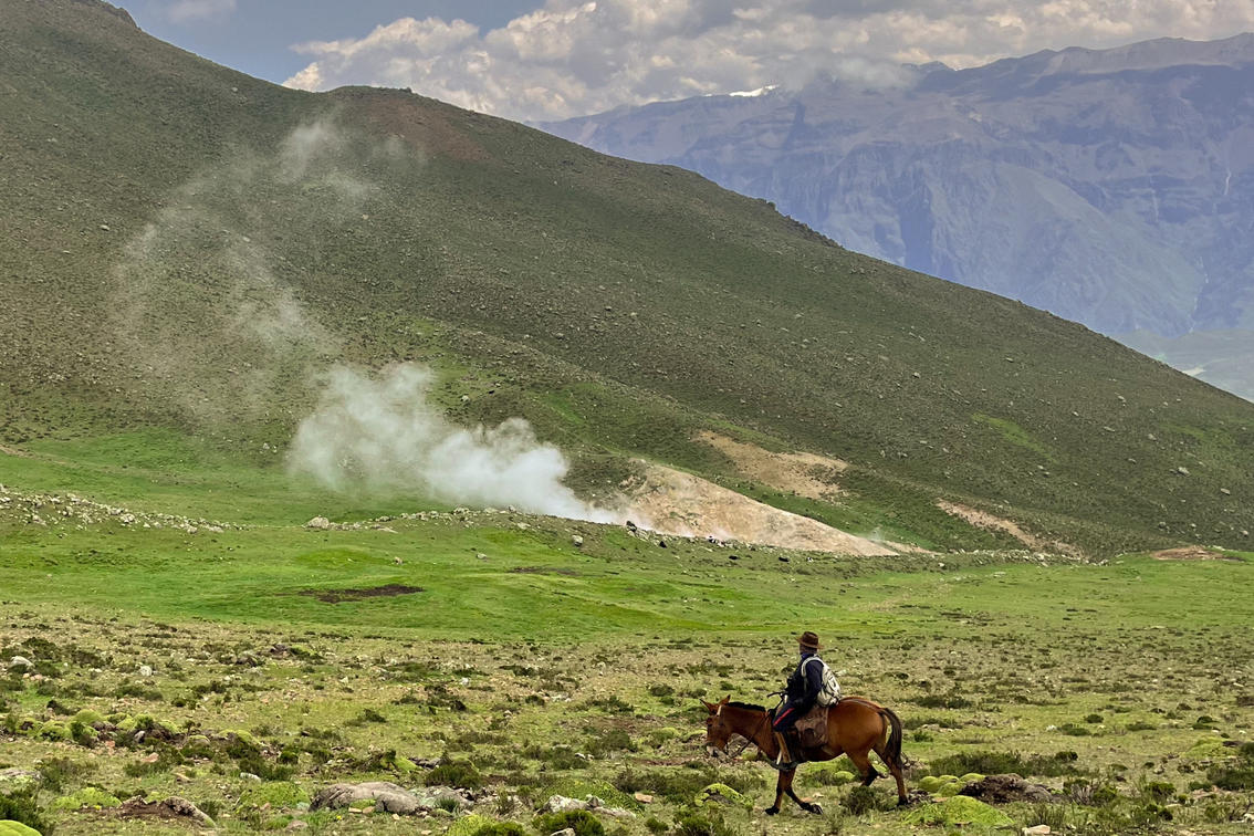 We set off at dawn, as the first light gently brushes the peaks of the valley. In Pinchollo, at over 4,400 metres above sea level, the journey begins on muleback — the only means capable of reaching such heights without a path — towards a volcanic world where steaming geysers, like eternal kettles, breathe in rhythm with the earth. Among canyons, mountains and the majestic flight of the condor, the landscape reveals itself in its purest state. The day concludes with a sunset picnic, in a setting that seems suspended in time.