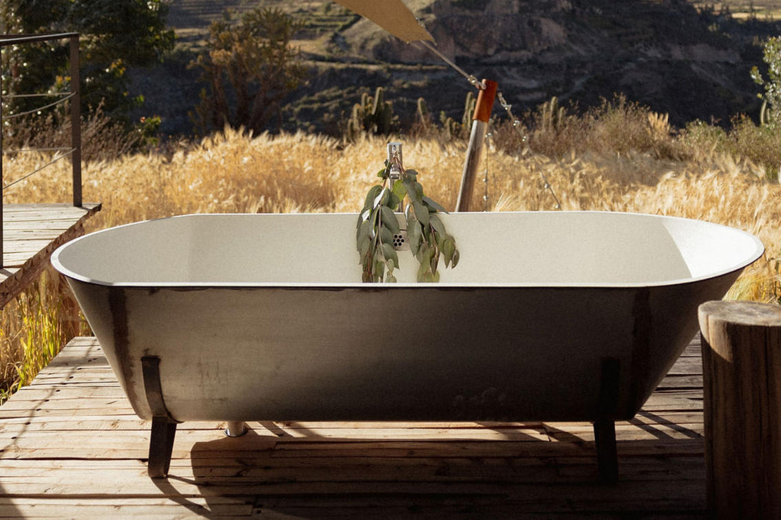 The Carpa Refugio, PUQIO's most commanding canvas tent, features a spacious indoor living area and terrace, a wood-burning stove, and a separate mudroom. Furnished with a King-size bed or two twins, it also offers a wide terrace, a reading area, an exterior bathtub, and both interior and exterior showers.